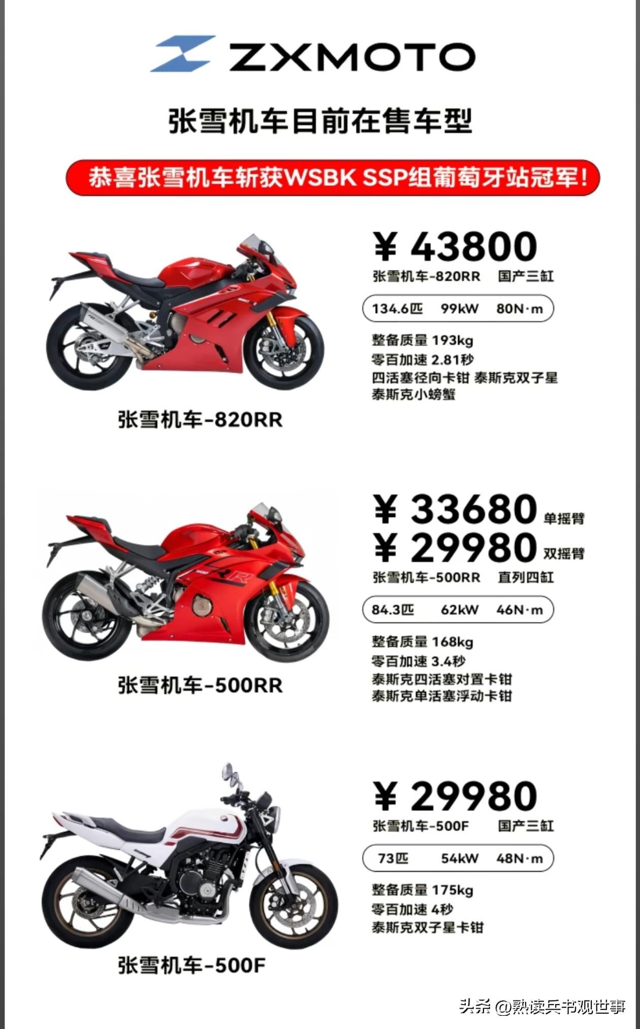张雪机车两连冠!我必须提个醒:你们动了巨头500亿的蛋糕,一定要小心! 说实话,看到张雪机车拿下WSBK第二个冠军,我第一反应是提气,第二反应就是狠狠捏了一把汗。 这件事,《孙子兵法》里的两句话,早就把背后的风险讲得透透的:一句是「匹夫无罪,怀璧其罪」,另一句是「兵者,诡道也」。 这可不只是一场摩托比赛的输赢,这是直接捅了国际百年摩托巨头的核心命门,动了一块价值500多亿的大蛋糕,这已经不是眼红不眼红的问题了。是涉及到他们生死局的苗头。 我给大家算一笔最实在的账,你就知道这事的分量有多重: 先说明面上的销量损失: 杜卡迪参赛的Panigale V2,一年全球卖1.2万台,单台售价13.8万。就算因为这场比赛丢了一半销量,直接损失就是8.3个亿。 雅马哈参赛的YZF-R9,一年全球卖2万台,单台售价9.2万。就算销量只掉40%,直接损失也有7.4个亿。 这还只是两款车型的明面上的损失,相比背后的品牌价值连零头都算不上。 WSBK是什么?是全球量产性能摩托的顶级殿堂,是性能的金字认证。你在这个赛场上被全程碾压,就等于向全世界宣告:你的摩托车在我这里就是个弟弟。 第二场比赛中,张雪机车的车手有一个小失误,落后了,然后在直道的时候,凭借着张雪机车的强劲动力,生吃了回来。展现了无与伦比的性能动力。 竞速比赛和文化类的比赛不一样,文无第一,你说他写的好,他说他写的好,这是没有固定标准的;但竞速类比赛,跑得快就是跑得快,这是一目了然,连小孩子都能分辨出来的。 看看以往的销量都和这个冠军有关系,谁拿下了冠军?谁家今年的销量就是冠军! 雅马哈、本田、川崎这日系三大厂,中量级仿赛是他们全球玩乐车型的核心利润支柱,品牌价值这次遭受了重大打击,就算缩水10%,也要30亿欧元,折合人民币231亿。 还有其他品牌加在一起,最起码500多亿的真金白银损失,这还只是今年的损失。 就现在西方也好,日本也好,全是吃老本的工业模式,会被张雪机车一直压制,只要霸榜五年,这些曾经的赛场王者,就会慢慢沦为圈子里的收藏品。 所以我才要给张雪团队提这个醒:现在最要紧的,不是庆祝夺冠,是做好万全的安保,保护好你们的赛车、你们的核心技术,更要保护好你们的赛车手。 西方、日系这些百年巨头,本来就是靠着海盗逻辑、垄断霸权起家的,他们从来不会跟你讲什么公平竞赛。 你现在可是动了他们上千亿的核心蛋糕,他们一定会用尽一切手段耍阴招、使绊子,我们已经见过太多太多国货之光,倒在了这种见不得光的手段里。 真的不希望,哪天在新闻上看到关于你们的意外消息。 你觉得张雪机车接下来最该注意什么?评论区聊聊你的看法。中国制造 兵法解读