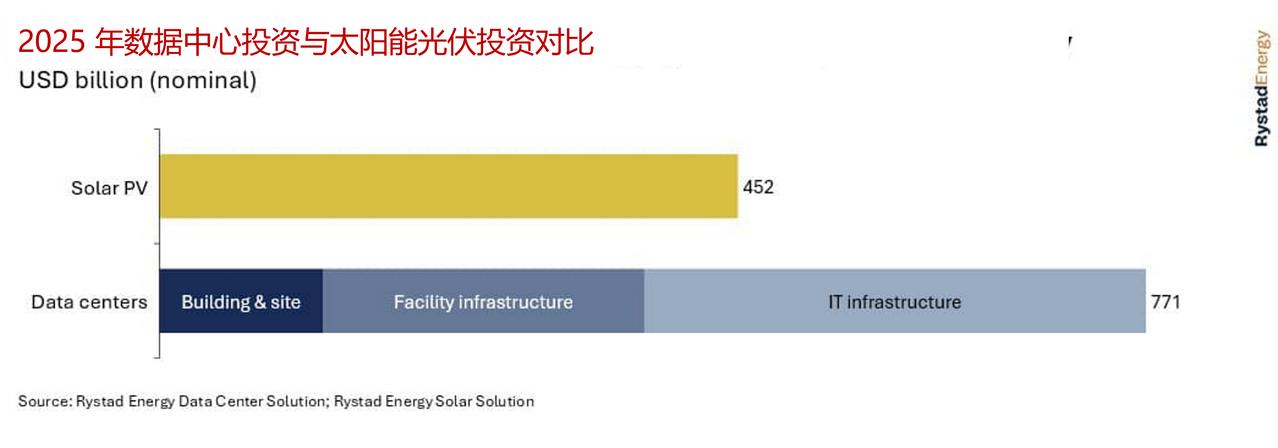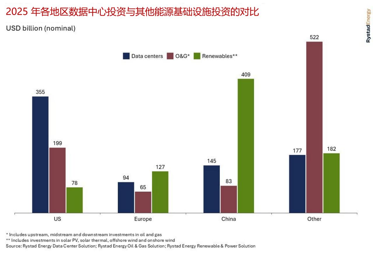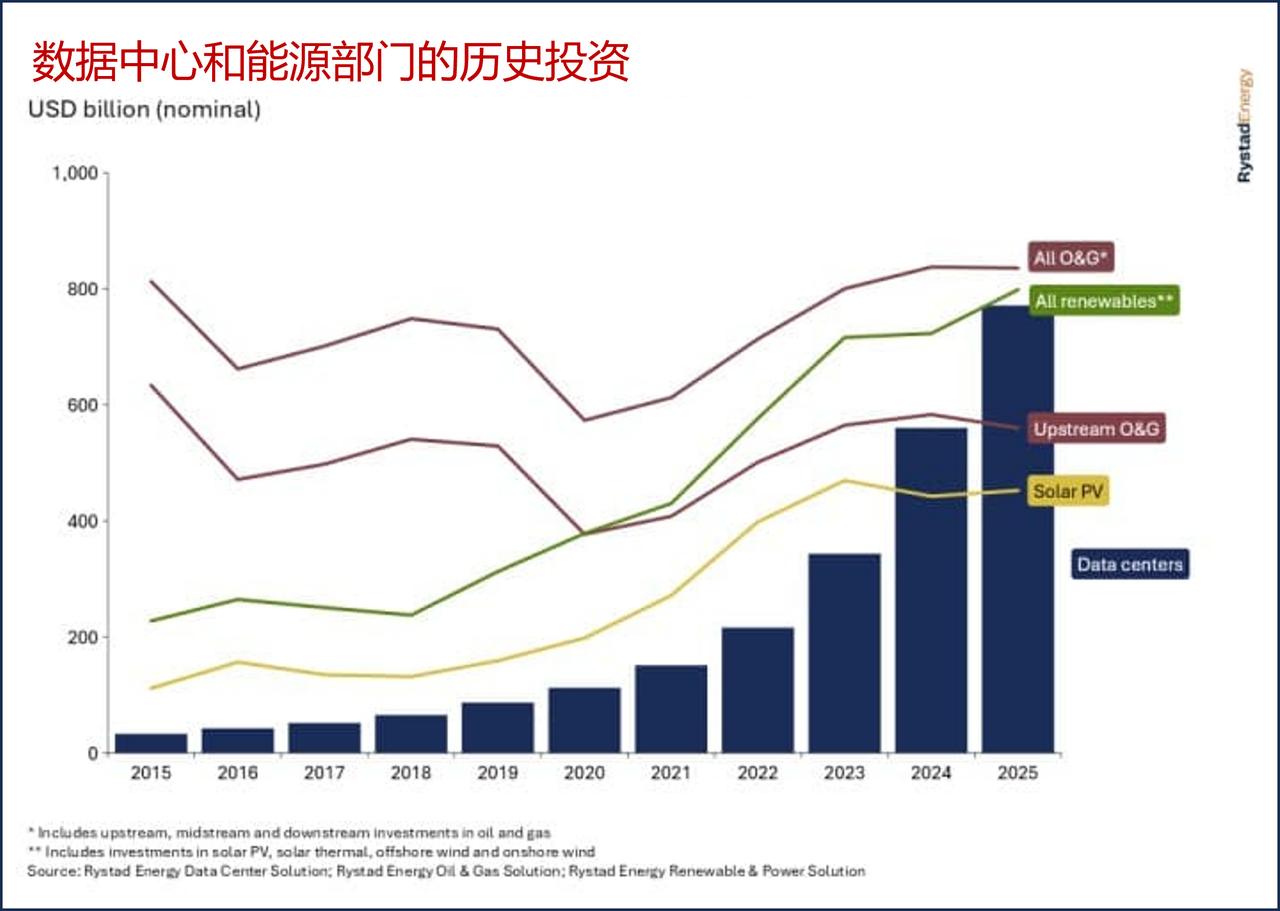 数据中心投资规模突破7700亿美元,比肩全球顶级能源市场 2025 年,全球数据中心资本支出达 7700 亿美元,超过同年油气上游领域的投资规模。光伏投资被公认为过去十年能源供应领域增长最迅猛的板块,而数据中心投资早在 2024 年就已超越光伏。国际咨询公司睿咨得能源预计,今年数据中心投资规模将与可再生能源发电行业、以及涵盖上中下游全产业链的油气行业总投资持平. 尽管加速器服务器等 IT 基础设施投资占比最大,达到 40%,但制冷系统、配电装置等基建与公用事业配套投资规模同样可观,几乎与全球光伏行业资本支出相当。在更广泛的产业生态中,数据中心的发展还带动了数千亿美元新增投资,流向发电资产、电网基建及全供应链领域。对能源市场参与者而言,数据中心正重塑市场格局,成为能源基建投资领域的代际性变革力量。 数据中心核心资产形态也开始升级,装机容量超 100 兆瓦的超大型数据中心成为主流类型。这类项目需要基建级别的大规模投资,却要求电力配套建设周期大幅缩短。当前数据中心投资主要集中于超大规模云服务商与科技巨头(如谷歌、亚马逊、微软、Meta平台公司),以及多家前沿人工智能实验室和全球头部数据中心运营商。这一格局与油气上游领域颇为相似,该领域投资大多来自国际石油巨头与国家石油公司。 行业投资分布也极不均衡。美国以绝对优势成为全球最大市场,2025 年装机容量占比达 42%,是排名第二的中国内地市场的两倍。印度位列第三,其装机容量与北美、亚太、欧洲多国组成的前十市场其余成员相比,优势并不显著。不过未来投资布局将更趋分散。随着多国数据中心电力需求占比突破 10%,电力供应、土地资源及基建配套的制约将迫使运营商开拓新市场,而这些企业也会随之带来资本投入。睿咨得能源基于装机容量风险评估模型预测,到 2030 年,芬兰、葡萄牙、泰国等市场将实现强劲增长。 能源领域已开始涌现这轮增长的受益方。电网升级需求、燃气轮机、变压器、燃料电池等设备需求激增,大幅提振了原始设备制造商的业绩。提供电网与发电设备的西门子能源,其股价自 2024 年 1 月以来涨幅超 10 倍;固体氧化物燃料电池制造商布鲁姆能源同期股价涨幅与之相当。三菱重工股价自 2024 年初上涨 6 倍,通用电气维诺瓦股价自 2025 年 1 月以来上涨 2.5 倍。 与所有高速增长领域一样,这场行业热潮也暗藏风险。各类资源约束、供应链延误与中断问题短期内难以解决,或进一步推高产品价格。尽管头部企业营收呈指数级增长,但该行业需达到油气行业的营收水平,才能支撑当前的投资规模。随着人工智能新需求与新应用不断涌现,这场由人工智能驱动的基建投资超级周期或将在未来数年持续,直至形成更稳定的投资环境,或市场对稳定环境的需求倒逼行业调整。超大型数据中心 数据中心设施 超级数据中心