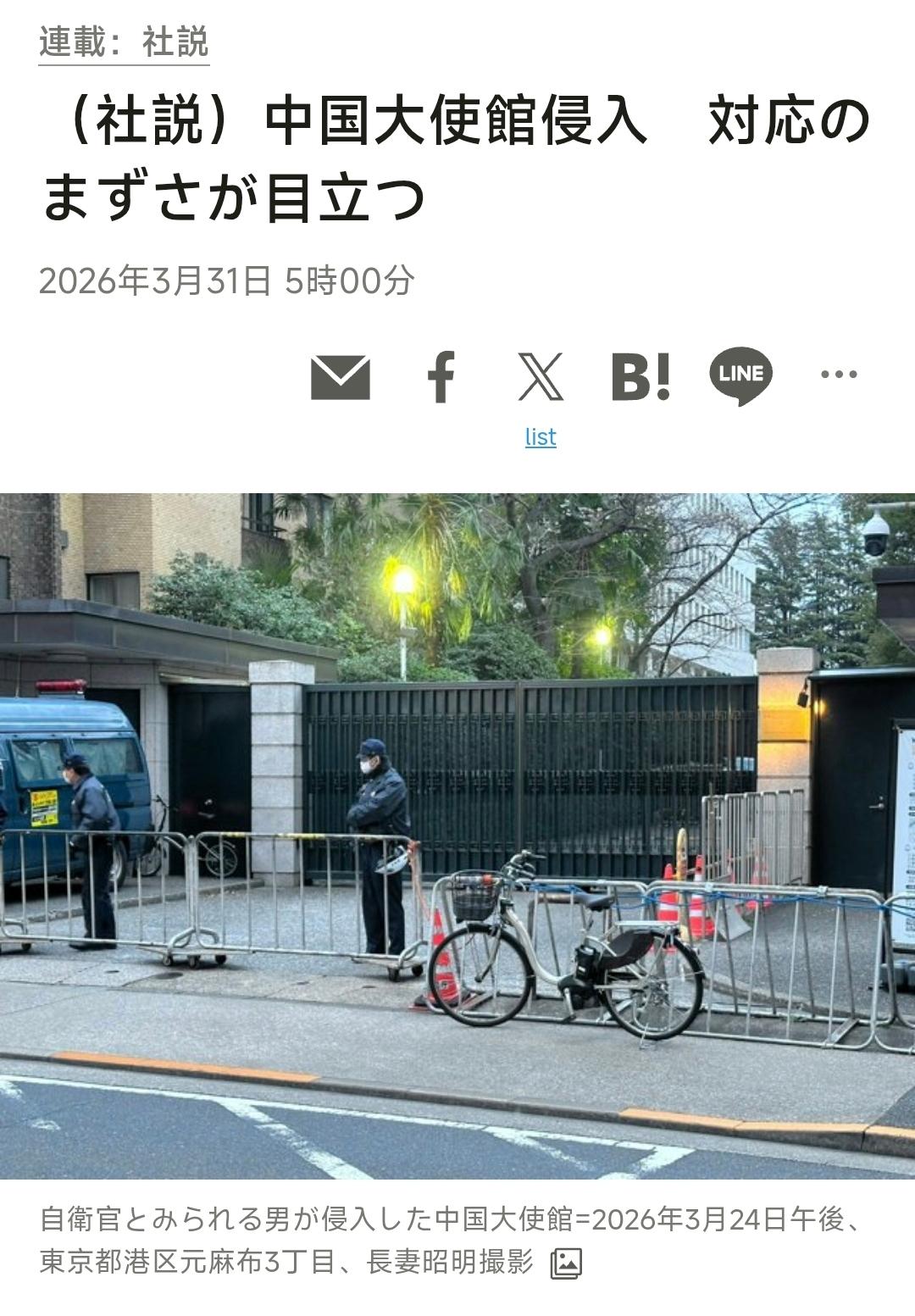 《朝日新闻》今天发表社论:闯入中国大使馆事件 日方应对失当显而易见 一名23岁现役自卫官涉嫌持刀闯入中国大使馆馆区被逮捕,正值日中关系遇冷之际,两国政府的反应形成鲜明反差。中方的激烈谴责虽有过当之嫌,但日本政府的应对同样存在诸多问题。这名刚被分配至宫崎县延冈驻屯地的三等陆尉,于24日闯入中国大使馆,据调查其供述动机为“希望中方收敛强硬言论”,还称若向大使转达意见遭拒便打算自尽。 大使馆的安全受《维也纳公约》保障,而嫌犯身为现役自卫官,中方的强烈反应本可理解,但中方所称嫌犯扬言“以神之名杀害中国外交官”的说法,与日方调查结果存在出入。中国外交部发言人称此事“再次反映出日本国内极右思想与势力猖獗,新型军国主义抬头酿祸”,该表述过于夸张,中方亦应保持言辞审慎。 即便如此,日方应对的迟缓,正是招致中方此番反应的重要背景。官房长官木原稔25日记者会上仅表示“遗憾”,而“遗憾”本指事与愿违的惋惜,此次事件是日方人员引发、且为政府相关人员的犯罪行为,该表述显然失当。 防卫大臣小泉进次郎直至27日才在记者会上提及此事,已然为时过晚,且其表态也仅是“深感遗憾”。日方这般应对,遭中方指责缺乏考量也在所难免。除致歉外,日方虽需等待警方调查结果,但也应展现出彻查事件的态度。试想若中国军人持刀闯入日本驻北京大使馆,便能体会此事的严重性;2024年中国深圳日本人学校一名就读儿童遇刺身亡,彼时岸田首相称其为“重大且严重的事件”,并要求中方说明事实、防止再发,此事亦值得日方反思。 日方此次应对的拖泥带水,是去年11月高市首相就“台湾有事”作出不当表态、导致日中关系恶化后的延续。若日方对此放任不管,此事恐将持续成为中方谴责日本的由头。日方本可借此次事件的妥善应对,成为修复两国关系的契机,倘若在理应明确认错的问题上始终态度含糊,恐怕只会让双边关系的裂痕进一步扩大。 [机智]评几句:通篇只有最后一句话最准确:“倘若在理应明确认错的问题上始终态度含糊,恐怕只会让双边关系的裂痕进一步扩大。其他的文字同样存在狡辩推脱之嫌。”《朝日新闻》的社论看似公允,实则处处为日方开脱,一边轻描淡写日方现役自卫官持刀闯使馆的严重违法行径,一边苛责中方的正当抗议“过于夸张”,全然无视《维也纳公约》对使馆主权的明确规定,无视嫌犯身为军人的特殊身份对双边关系的挑衅。日方从官房长官到防卫相,要么用“遗憾”这种模糊表述敷衍塞责,要么姗姗来迟毫无诚意,这般轻慢的应对本就是错上加错,社论却将中方的强烈反应归咎于“言辞不够审慎”,颠倒黑白的意味十足。更可笑的是拿深圳日本人学校事件对比,彼时日方要求中方彻查追责,如今自身犯下同类更严重的过错,却连一句诚恳道歉都不愿说,双重标准暴露无遗。社论看似指出日方应对失当,实则通篇避重就轻,不愿直面日本国内极右思潮抬头、政客屡屡触碰中方红线的根本问题,这样的“反思”,不过是换种方式的狡辩,根本无法弥合双边关系的裂痕,反而只会让外界看清日方缺乏正视错误的诚意与担当。
