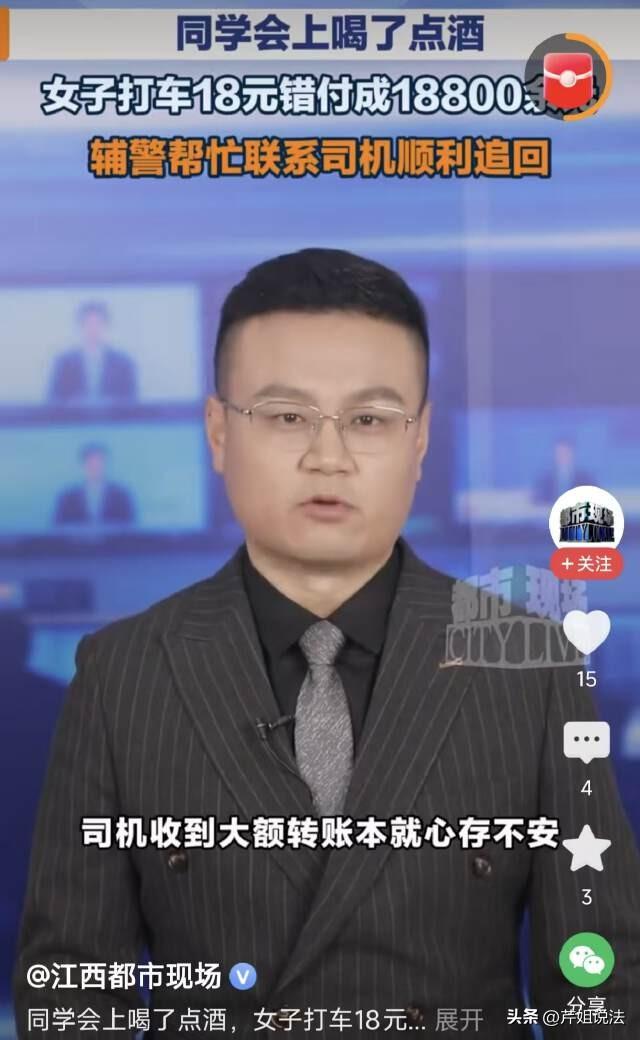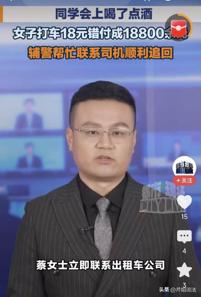 湖北江汉,蔡女士去参加同学聚会,一不小心喝多了,乘坐出租车回家时,蔡女士竟然误将18元车费付成了18000元。第二天酒醒蔡女士懵了,赶紧报了警。可让人没想到的是,头天晚上送蔡女士的司机竟然做出这个动作。 事情的起因还要从一场同学聚会开始说起,蔡女士和多年未见的高中同学相约在了汉江区的一个高档酒楼,想要和同学一起忆往昔峥嵘岁月,见一见心上的白月光。 傍晚时分,蔡女士将自己梳妆打扮,当窗理云鬓,对镜贴花黄,美滋滋的打扮了一番。 看着镜子里的自己,蔡女士好像又回到了那个高中, 镜子中自己成熟的脸逐渐和记忆中那张青涩的脸重叠在了一起,不禁哑然失笑。 很快蔡女士整理好了行头,来到了同学聚会的现场。 看着眼前的老同学们,蔡女士心中不免泛起了涟漪,时光荏苒,大家的脸上都已经有了岁月的痕迹,时间像一把无情刻刀改变了我们模样,可是心里的同学情却并未褪色半分。 见到高中的白月光,也并没有想象中的激动,只是淡淡的打了招呼,按下了心中的波涛汹涌,随着聚会的进行,蔡女士不免多喝了几杯,乘着醉意还上台演唱几首歌曲。 快乐的时光转瞬即逝,很快到了散场的时候,蔡女士拒绝了同学的好意,叫了的士师傅,给自己送家,班长还怕她喝的太醉了,让蔡女士到家发个信息确认。 把蔡女士扶上出租车,交代好地点以后,班长便离开了,不胜酒力的蔡女士在出租车上睡了一路,到家以后还是的士师傅拍了拍蔡女士的肩膀,蔡女士才醒过来。 可能是酒精令人上头,也许是刚睡醒意识还不清醒,蔡女士在付款的时间竟然将原来的18元车费付成了一万八千元,的士师傅也因为急着跑下一单而忽略了这个细节。 可是当第二天蔡女士醒来以后,头还在痛呢,就看到自己的余额整整少了一万八千元,一下子就将蔡女士给吓醒了,于是忙不迭的翻找着自己的消费记录。 查出来是在昨天支付出租车费的时候用掉的,蔡女士赶忙联系了出租车公司,希望可以追回多支付的款项,却因为阴差阳错,联系不上昨晚的的士师傅。 原来这个师傅昨晚熬夜开车,现在正在补觉呢。 这可急坏了蔡女士,生怕自己的钱追不回来,于是便拨通了报警电话,想要尽快追回自己的钱,值班的辅警宋某接到了蔡女士的电话。 在详细了解了事情的经过以后,宋某承诺一定会帮蔡女士追回她的财产,还仔细的询问了蔡女士这个事件的各个细节,比如他们办同学聚会的地点,蔡女士最后下车的地点,的士师傅是属于那个出租车公司的,以及蔡女士支付的证明等等。 在收集好这些信息以后,宋某综合了当地的摄像头,逐步排查线索,最终成功联系上了这个的士师傅,说明了这个事情的来龙去脉。 这个师傅一开始还以为是诈骗电话,直到宋某把自己的工作信息说出来以后,才取得了他的信任,在听完整个事情的经过后,司机师傅也去确认了自己的余额,确实是多了这一万多元钱。 于是便与宋某约好,当天晚上就去在各位民警同志的见证下,将多出来的车费转给了蔡女士物归原主。 根据《民法典》中第一百二十二条,因他人没有法律根据,取得不当利益,受损失的人有权请求其返还不当利益。 第九百八十五条,得利人没有法律根据取得不当利益的,受损失的人可以请求得利人返还取得的利益。 在本文中,蔡女士在醉酒状态下支付的一万八千元,对司机而言属于没有法律根据取得的利益。 如果司机拒不返还,蔡女士可以依据《民法典》第九百八十五条,要求的士司机返还不当得利。 但是如果司机师傅拒绝返还蔡女士多付的钱,那么将会构成侵占罪。 根据《刑法》第二百七十条规定,将代为保管的他人财物非法占为己有,数额较大,拒不退还的,处二年以下有期徒刑、拘役或者罚金。 好在事情并没有发展到那个地步,在民警的介入下得到了完美的解决,屏幕前的您是怎么看待的呢?欢迎在评论区留下您的评论