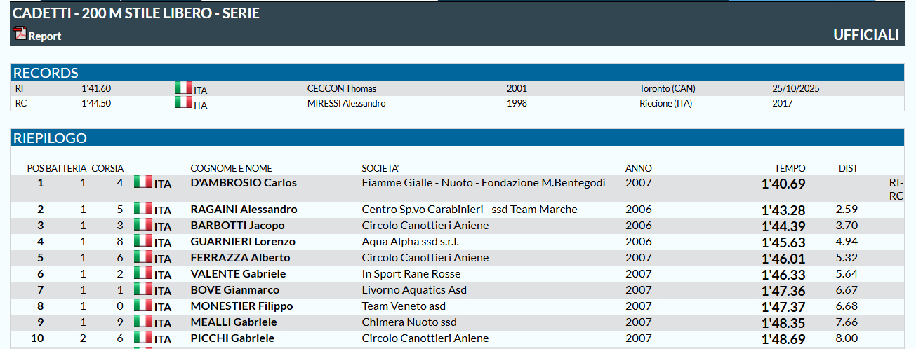 意大利青少年游泳锦标赛 男200自,Carlos D'Ambrosio 1:40.69 NR