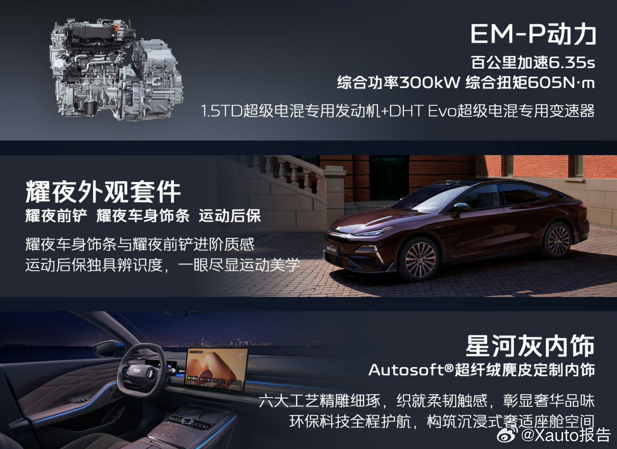 动力与续航方面,新车搭载1.5T+电机组成的EM-i插混系统,系统综合功率300kW,零百加速6.35秒。配合神盾金砖电池,CLTC纯电续航提升至225km,综合续航里程突破1700km,支持15分钟快充及6kW外放电功能。汽场全开吉利银河星耀8远航家吉利银河吉利银河星耀8