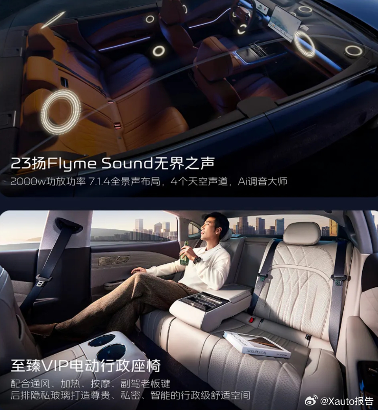 车内搭载15.4英寸中控屏,内置Flyme Auto2代系统,标配全景天幕、前排座椅通风/加热/按摩、主驾按摩、副驾老板键。