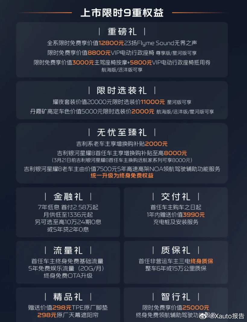 3月30日,吉利银河星耀8远航家正式上市,新车推出航海版、远洋版、星河版3款车型,官方指导价14.28-16.18万元,限时先享价低至12.98-14.88万元。