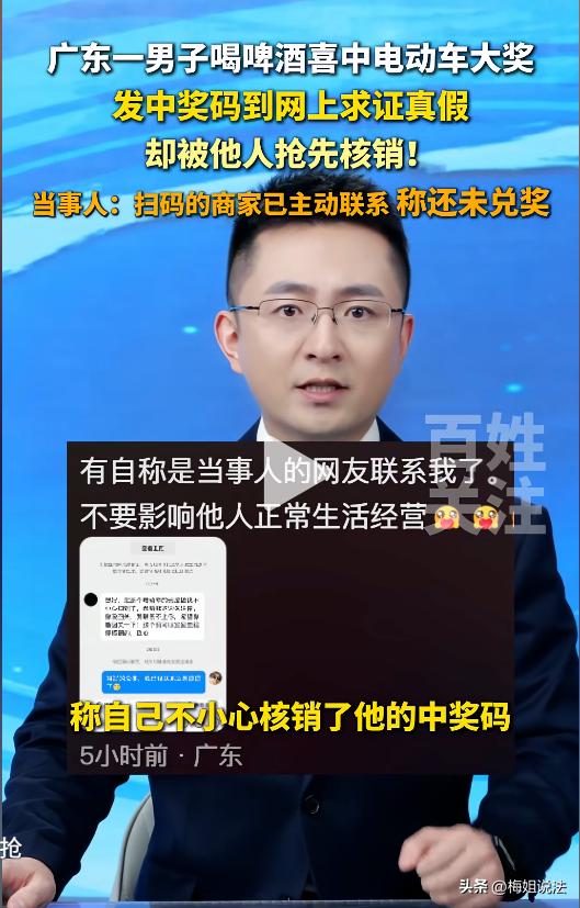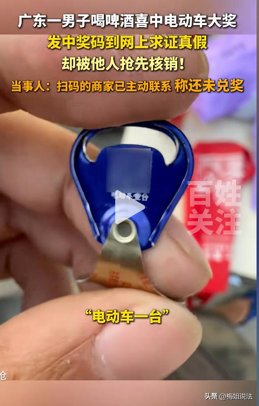 财真不能外露!广东肇庆,男子在喝酒时,发现酒瓶盖标有中奖标识,奖品是电动车一台。男子扫了一下二维码,却显示不是商家身份不能核销。为了验证真假,男子竟然把二维码发到网上求证,结果差点空欢喜一场。 这天晚上,男子在家喝酒,刚打开啤酒拉环,撇了一眼上面有字,定睛一看,差点没握住手上的啤酒。拉环内侧写着“电动车一台”,并附有二维码。 男子不敢相信自己中奖了,几块钱的啤酒还能附赠这么大的福利? 于是,他半信半疑,用手机对着拉环上的二维码扫了扫,界面弹出“非商家,不能核销”的字眼。 男子心凉了一大半,难道不是商家就不能领奖了? 他不甘心,一定要寻求个结果。 男子把中奖经过和拉环拍了视频,发到网上求证,希望啤酒厂家能给出答复。 本来是抱着验证奖项真假的决心,没想到差点让自己后悔半生。 由于男子拍视频时,把拉环的二维码也拍出去了,丝毫没有掩饰,结果第二天一睡醒,再次扫码的时候,界面显示“二维码已被核销”。 男子顿时傻眼了,自己本来还心心念念能通过网络找到厂家,兑换一台电动车给家人,没想到被人抢先核销了! 男子马上打开评论区,使劲翻找聊天记录,向网友求助“如果二维码被核销了,还能兑换奖品吗?” 得到的答案让男子的心情一下子沉到了谷底。 他不是不知道奖品兑换的规矩,一旦二维码被核销,自己就没有权限去兑换奖品了。 都怪自己太大意了,想要验证奖项真假,结果被人“偷”了去。 家里刚好需要一辆电动车,平时买菜什么的方便出行,要是这能换来车,家人指不定得有多高兴。 可是这下倒好,偷鸡不成蚀把米,奖项泡汤了,男子的心情凉了一大截。 就在男子心灰意冷的时候,手机弹跳出来一则陌生人的信息,发来信息的是一位商家,他解释道,看到网上的二维码,一时兴起,用手机扫来一下,没想到真的核销成功了,不过还没有兑换电动车,让男子可以联系当地的厂家兑换。 男子看到消息,又惊又喜,马上联系当地的厂家,把事情经过,和相关的证据截图一并发过去。 啤酒厂家了解了事情经过,核实了核销人的身份,确认对方没有兑换电动车,就给男子办了兑换电动车手续。 男子终于如愿地领到中奖的电动车了。 一场差点就竹篮打水一场空的惊喜,就这样迎来了反转。几天后,男子再次拍照上传,视频里他坐在一台崭新的电动车上,笑得合不拢嘴。 那么,在此次事件中,如果商家冒领了电动车,会面临怎么样的处罚呢? 根据《民法典》第九百八十五条有明确规定:得利人没有法律根据取得不当利益,造成他人损失的,受损失的人可以请求得利人返还取得的利益。 商家拿着不属于自己的二维码进行核销,兑换礼品,拿了不属于自己的东西,就属于不当利得。 如果他不主动归还,反而占为己有,男子可以凭借截图和视频起诉商家。 到那时,商家不仅要退还电动车,还要承担因此给男子造成的额外损失,比如维权费、误工费等。 再说说厂家,这件事情虽然从法律的角度上看,没有强制要求兑换奖品要实名验证,但这也给设置奖品的举办方提了一个醒,应当完善兑奖规则,避免消费者利益受损,有奖扯不清,一旦消费者维权起来,可能会被追究违约责任。 对于商家的行为,你怎么看?