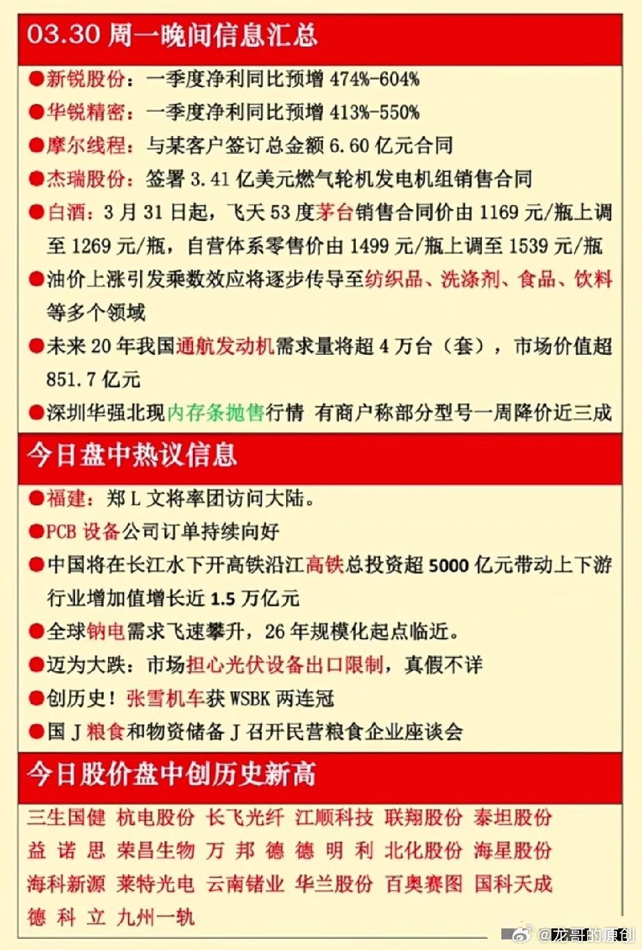 1. 业绩大超预期新锐股份、华锐精密一季度净利预增均超400%;摩尔线路、杰瑞股份获大额订单,业绩弹性较强。2. 消费提价催化飞天茅台今日起上调出厂价,利好白酒板块情绪;油价上行,传导至纺织、食品等下游消费链。3. 长赛道景气未来20年通航发动机市场超850亿;钠电、PCB设备、沿江高铁等方向持续高景气。4. 热点催化世界数据组织成立、太空算力大会将至,数据要素、算力概念迎事件驱动。5. 风险提示内存价格短期下跌、光伏设备出口限制传闻扰动市场,注意板块波动风险。