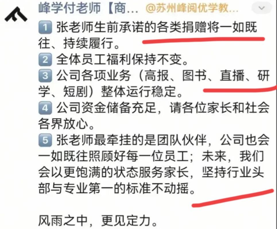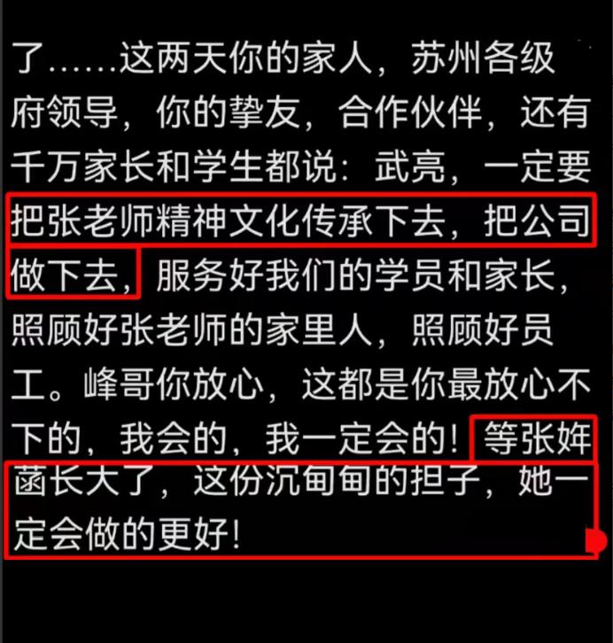 张雪峰去世头七这天,公司总经理武亮发了一篇长文悼念,里面不仅说了对公司未来的安排,还亲口透露了对张雪峰11岁女儿张姩菡的规划,更让人心里发酸的是,武亮在回复里说,已经把张雪峰生前常骑的那辆电瓶车仔细擦拭干净,好好保存起来了。 头七本就是寄托哀思的日子,武亮没搞任何花里胡哨的形式,一篇长文,字字都是实在话,没有刻意煽情,却比任何华丽的辞藻都戳人。 他在文中把公司未来的走向,说得明明白白。不会因为张雪峰的离开就散伙,也不会偏离原本的教育方向,会接着把张雪峰想做的事做下去,守住那些信任他们的家长和学子。 很多人都在担心,张雪峰走后,他一手打拼的事业会不会就此垮掉。武亮的表态,算是给所有人吃了一颗定心丸。 紧接着,他重点提到了张雪峰最放心不下的人——11岁的女儿张姩菡。这孩子还没真正读懂父亲的伟大,就突然失去了依靠,想想就让人揪心。 武亮看得很透彻,也想得十分周全。他明确表示,张雪峰的所有个人账号、发布过的每一条作品,都会原封不动保留,不删不改,等张姩菡长大成人,再亲手交到她手里。 那不是简单的账号,是张雪峰一辈子的心血,是他熬夜打磨的干货,是他帮无数人指点迷津的痕迹,更是留给女儿最珍贵的精神遗产。 除此之外,武亮还亲口承诺,等张姩菡成年后,会把张雪峰一手创办的公司,完完整整交到她手里。这份承诺,不是随口安抚,是他和团队对张雪峰的郑重交代。 了解他们的人都知道,武亮和张雪峰早已超越了上下级关系。五年前,武亮还是个迷茫的年轻人,是张雪峰看中他的潜力,手把手教他做管理、跑业务,把他从一个新手,培养成能独当一面的总经理。 张雪峰生前,就把武亮当作接班人培养,原本计划着慢慢交接,自己放缓脚步多陪陪家人,可意外来得太突然,这份托付,整整提前了十几年。 武亮接手的,不只是一家公司,更是一份沉甸甸的责任,一份跨越生死的信任。而最让人破防的,还是那辆被仔细保存的电瓶车。 张雪峰这辈子,从来不爱讲排场,日常出行全靠这辆普通的电瓶车。他骑着它接送女儿放学,骑着它赶去公司加班,骑着它穿梭在街头巷尾,没有豪车的体面,却藏着最朴素的父爱和最踏实的坚守。 有网友留言担心电瓶车被雨淋,武亮看到后立刻回复,已经擦拭干净、妥善保存。短短一句话,没有多余的修饰,却藏着最细腻的心意。 他保存的从来不是一辆普通的代步工具,是张雪峰活过的痕迹,是一个父亲对女儿的温柔,是一段再也回不去的朝夕相处。 之前网上还有不少谣言,说公司要抹去张雪峰的痕迹,说武亮要夺权。可武亮的每一个举动,都在狠狠打脸这些谣言。 公司之前改名,不是死后临时决定,是张雪峰生前就敲定的,因为原名字有商标纠纷,既保留了“峰”字延续印记,又规避了风险。研途考研撤下他的海报,也只是正常品牌迭代,毕竟张雪峰早就退出了那家公司的日常运营。 武亮在长文里一一澄清这些误会,没有回避争议,足够坦诚,也足够有担当。其实武亮做的这一切,从来都不图什么。没有利益纠葛,没有刻意炒作,只是一份知遇之恩,一份兄弟情谊,一份沉甸甸的承诺。 张雪峰这辈子,帮过无数普通人,活成了很多人的光。他走后,武亮用自己的方式,延续着这份光,守护着他的心血和家人。 这份坚守,这份深情,无关名利,只为初心。愿张雪峰安息,愿年幼的张姩菡能在守护下平安长大,也愿武亮能守住承诺,把这份事业继续好好走下去。