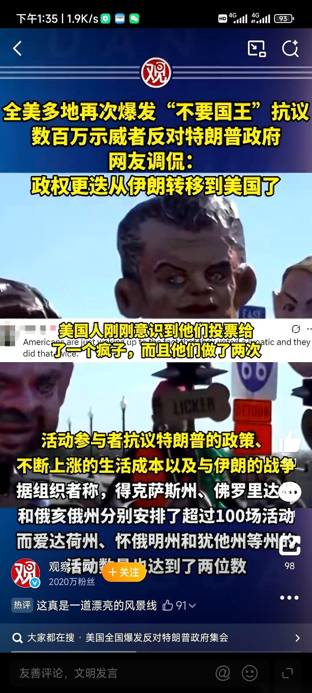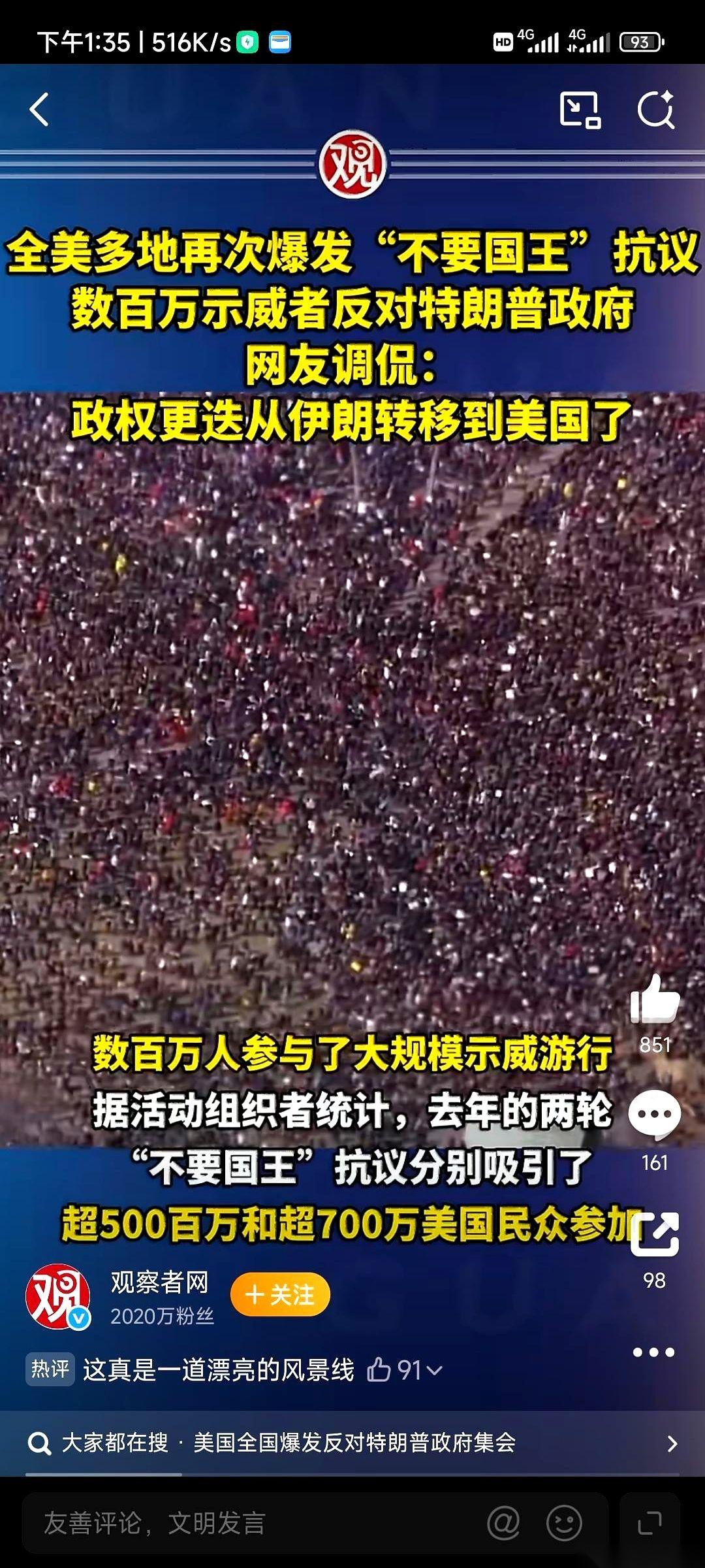 美国那场反战游行,开场就扔出个王炸:一天之内,纽约、华盛顿、芝加哥,九百多万人涌上街头。 人潮里,标语牌像森林一样立着,上面写的不是别的,是“我们的军队不出售”、“我们不要国王”。喇叭里喊出来的,是对着白宫喊的:“别去打伊朗!” 最狠的是,就在他们准备去别人家门口点火的时候,自己家后院先烧起来了。大洋彼岸的以色列,同样的反战声浪也冲上街头,人们举着牌子,盯着政府大楼,要的也是同一件事:换人。 而那位总统呢?面对自家门口山呼海啸的反对声,镜头扫过去,他只是耸耸肩,半开玩笑地对着媒体说,他想去委内瑞拉当总统。 这剧本,真是绝了。 一门心思想去别人家换牌桌,结果自家屋顶先被掀了。
