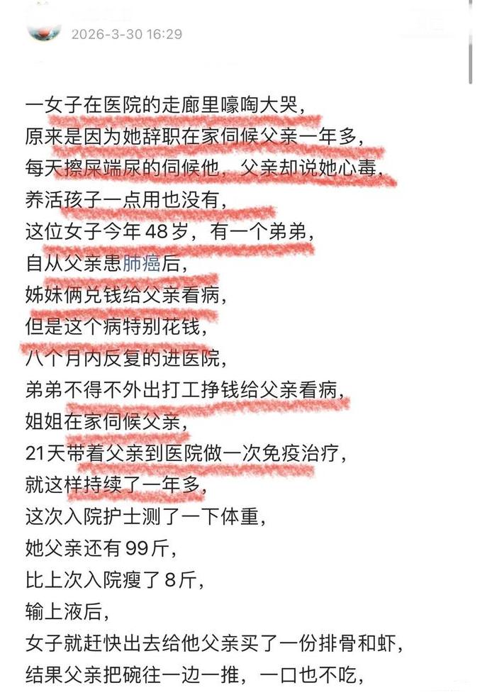 “太寒心了!”河南郑州,一名48岁的女儿辞职在家,贴身伺候患肺癌的父亲整整1年。谁料父亲非但不感恩,竟在病房里当众把女儿买的排骨大虾一把推开,大骂女儿“心毒”、“养活了没用”。逼得同病房的病友当场发飙,一番话直接揭开了病房里最残酷的人性真相。网友:“有些父母,你是用命都捂不热的!” 48岁的王大姐(化名),原本有着自己安稳的生活。可自从老父亲查出肺癌后,一家人的平静就被彻底打破了。 治这病简直就是个无底洞,眼看着花钱如流水,姐弟俩一商量,干脆分工合作:弟弟咬紧牙关收拾行李外出打工,拼命挣钱凑医药费;王大姐则直接辞了职,全天候守在父亲床前贴身伺候。 这1年多来,王大姐的日子可以说是泡在了苦水里。就拿这短短的8个月来说,老父亲反反复复住院,她每隔21天就要带父亲去医院做一次免疫治疗,每天更是擦屎端尿,寸步不离。 前几天,父亲再次入院。护士一称体重,老头只剩下99斤,比上次住院足足瘦了8斤。王大姐看着心疼得直掉眼泪,等给父亲挂上吊瓶,她赶紧跑出医院,自掏腰包买了一份热腾腾的排骨和大虾,想给老人家好好补补身体。 可谁能想到,这端到床前的肉,换来的竟是劈头盖脸的一顿羞辱。 老父亲看都没看一眼,一巴掌把碗推到一边,一口都不吃。紧接着,他当着全病房人的面,指着王大姐骂骂咧咧,嫌弃她每天弄的都是这些东西,骂女儿“跟个死人似的”。这还不算完,老头甚至转头跟临床的病友抱怨,说自己这个闺女“心特别毒”,养活孩子一点用都没有。 王大姐一句话没说,转身冲进医院走廊,靠着冷冰冰的墙壁嚎啕大哭。 可这一幕,把临床的病友彻底惹火了。 病友指着老头毫不客气地回怼:“你家姑娘一夜起来10来次扶着你小便,你在家也这么折腾她吗?你就不能自己用个便壶?吵得我一夜都没睡着,我都不知道你家姑娘咋熬过这么多天的!” 病床前的这一幕,撕开了“久病床前无孝子”的另一面。 有时候不是子女不孝,而是无休止的病痛扭曲了亲情,把至亲之人的付出毫不留情地踩在了脚下。这起发生在病房里的风波被发到网上后,瞬间戳中了不少有类似经历家庭的痛点。 大家看在眼里,痛在心里,有人感同身受地感慨。 有人认为,父母要是不喜欢你,哪怕你把心掏出来给他看,在他眼里也一文不值,这种偏心和无视是刻在骨子里的。 也有脾气火爆的过来人直言,越是顺从越被欺负,不如直接走人,很多老人的无理取闹纯粹是惯出来的,你一旦翻脸,他们反而不敢吭声了。 但也有理智的声音提醒大家,千万别跟重病的人计较。 病人长期受尽病痛折磨,心理早已崩溃,他们因为自身的痛苦,往往看不见别人的付出,只会通过对最亲近的人发脾气来宣泄对死亡的恐惧。 姑娘只能多想想父亲健康时的好,咬紧牙关把这段最难的日子熬过去。 这事儿说到底,就是病魔对人性和亲情的双重凌迟。 伺候重病老人,熬的不光是体力,更是心血。面对一个被病痛折磨得性格大变、甚至满怀恶意的老人,做子女的拼尽全力却换来满腹委屈,这才是成年人世界里最深切的无力与悲哀。 对此,你怎么看?