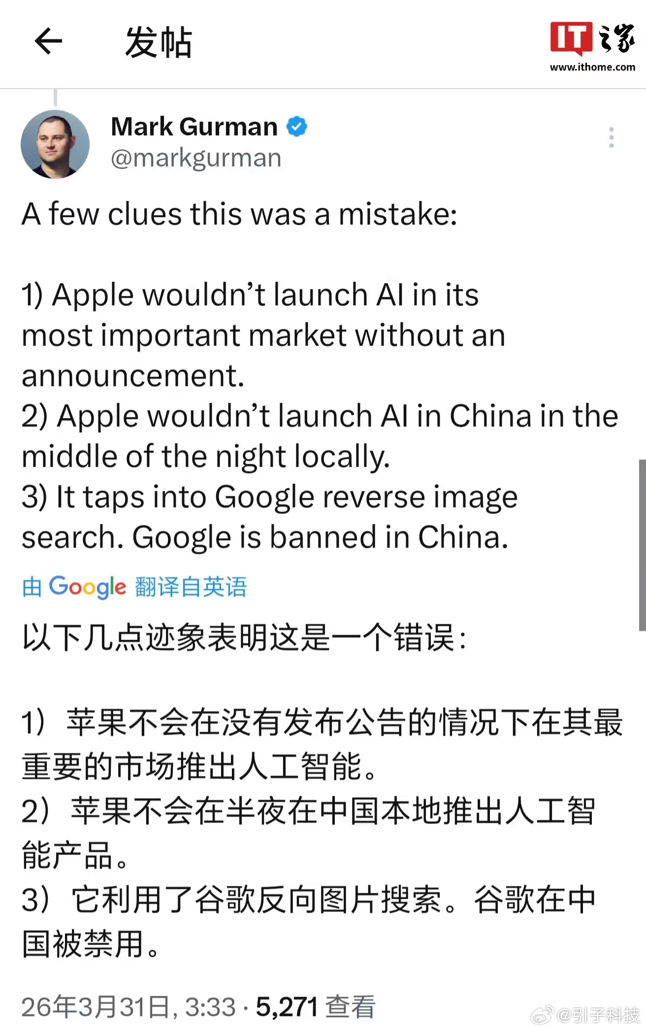 1)苹果不会在没有发布公告的情况下在其最重要的市场推出人工智能。2)苹果不会在半夜在中国本地推出人工智能产品。3)它利用了谷歌反向图片搜索。而谷歌在中国被禁用。