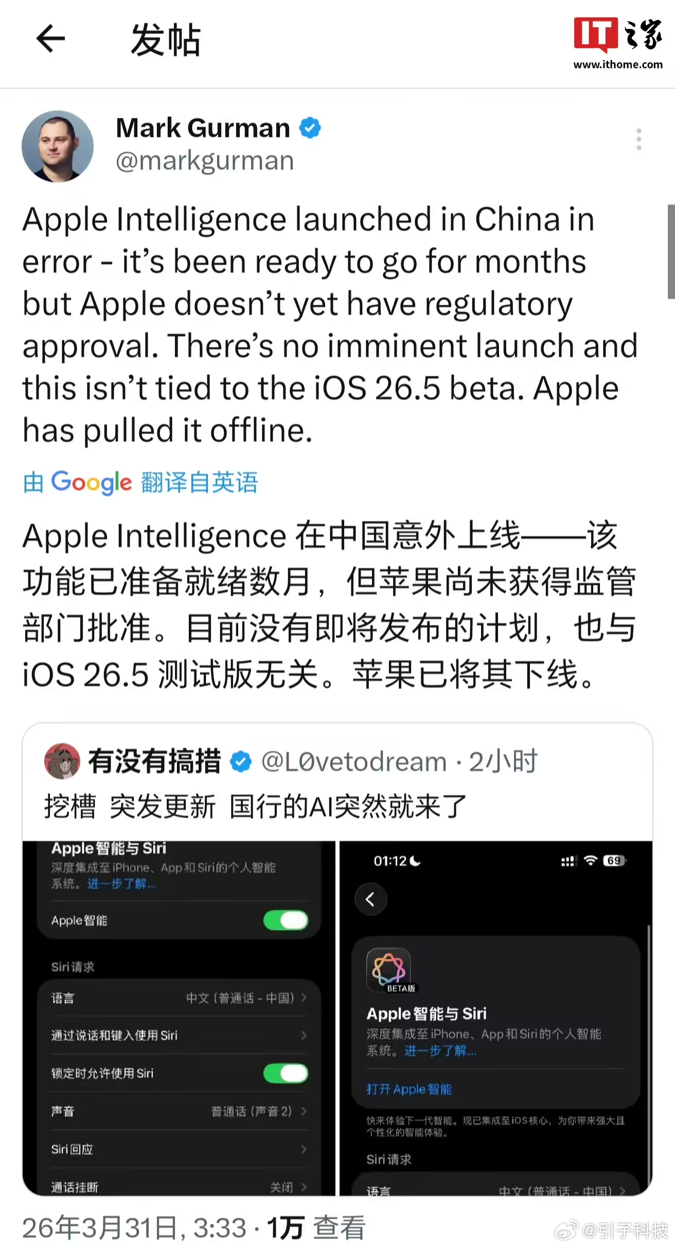 【苹果下线国行版AI】IT之家3月31日消息,据彭博社记者马克·古尔曼今日消息,Apple Intelligence在中国属于意外上线,该功能已准备就绪数月,但苹果尚未获得监管部门批准。目前没有即将发布的计划,也与iOS 26.5测试版无关。苹果已将其下线。