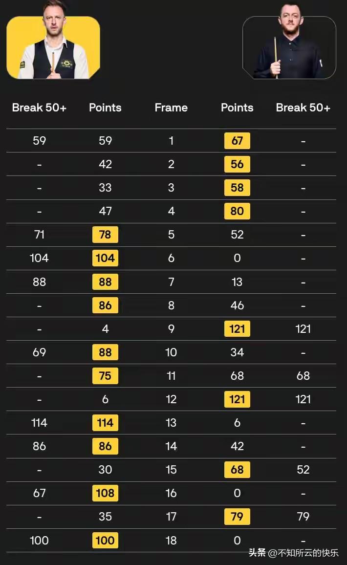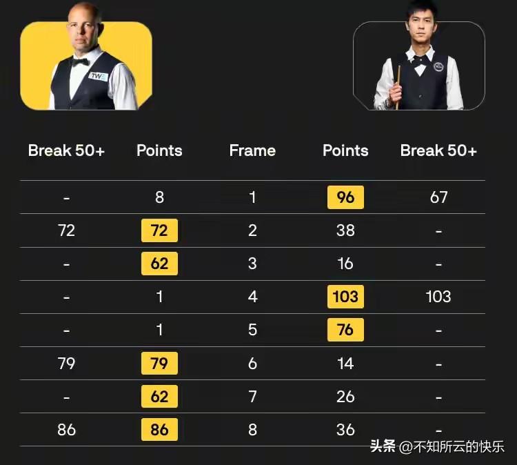 城头变换大王旗!特鲁姆普,首位巡回锦标赛晋级者。 如果你看了特鲁姆普和马克艾伦的前四局比赛,一定不会觉得这是世界第一的表现,面对艾伦屡屡错失良机0:4落后。 然而坐在这个位置的那有浪得虚名之辈,一波四连鞭扳平了,这或者就是硬实力的体现,6:6平特鲁姆普越战越勇,8:6领先了,最终10:8拿下。 这还是中国斯诺克的大敌,长局制看到了开始未必结果相同,再来看看两场未完比赛。 霍师傅依旧宝刀未老,面对士气逼人的泰国塔猜亚稳扎稳打,三连平直到半场结束5:3暂时领先,结果还待今晚决出,鹿死谁手还未可知,不过我倒是希望塔猜亚胜出。 重点还是看看吴宜泽对战韦克林这边,小吴状态不错,韦克林先胜一局,吴宜泽连扳三局,心一下安稳许多,后四局如出一辙,6:2这是一个比较让人放心的比分。 虽说双方都没打出破百,不过吴宜泽5杆70+的致胜杆,足以代表他的状态不错,接下来只需要保持我们就能看到吴宜泽&赵心童的中国德比大战。 加油吧中国球员!