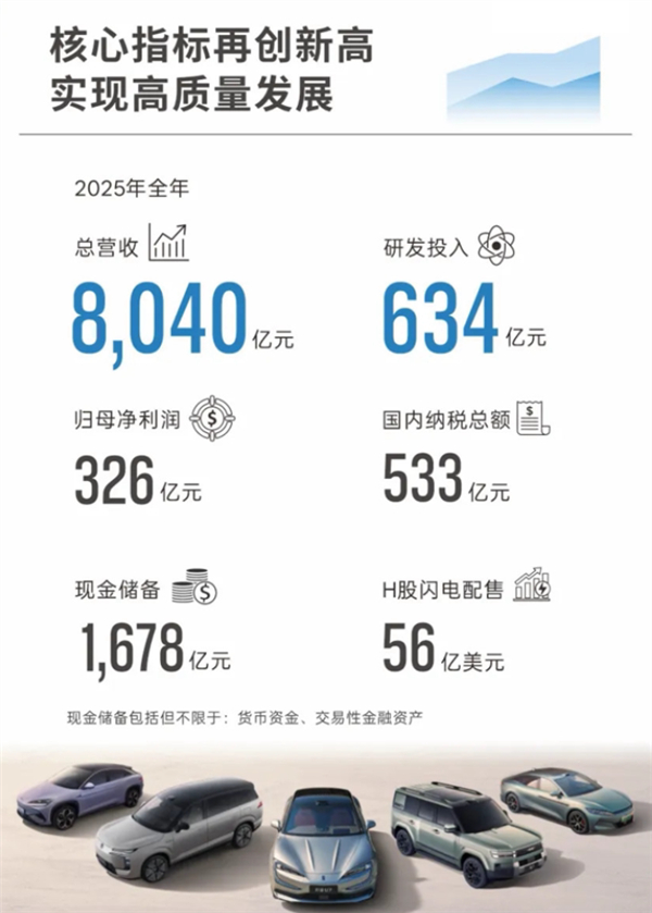 核心业绩销量:460.24万辆,蝉联全球新能源销冠、中国市场销冠、中国品牌销冠营收/利润:8040亿元(第二名近2倍)、净利润326亿元,稳居行业双料第一研发投入:634亿元(+17%,连续多年A股第一),累计超2400亿元;纳税533亿元(超净利润)全球化:海外出口105万辆(+145%),覆盖119国,占总销量22.8%高端化:方程豹/腾势/仰望三大品牌销量39.66万辆(+109%),20万+价格带渗透率翻倍