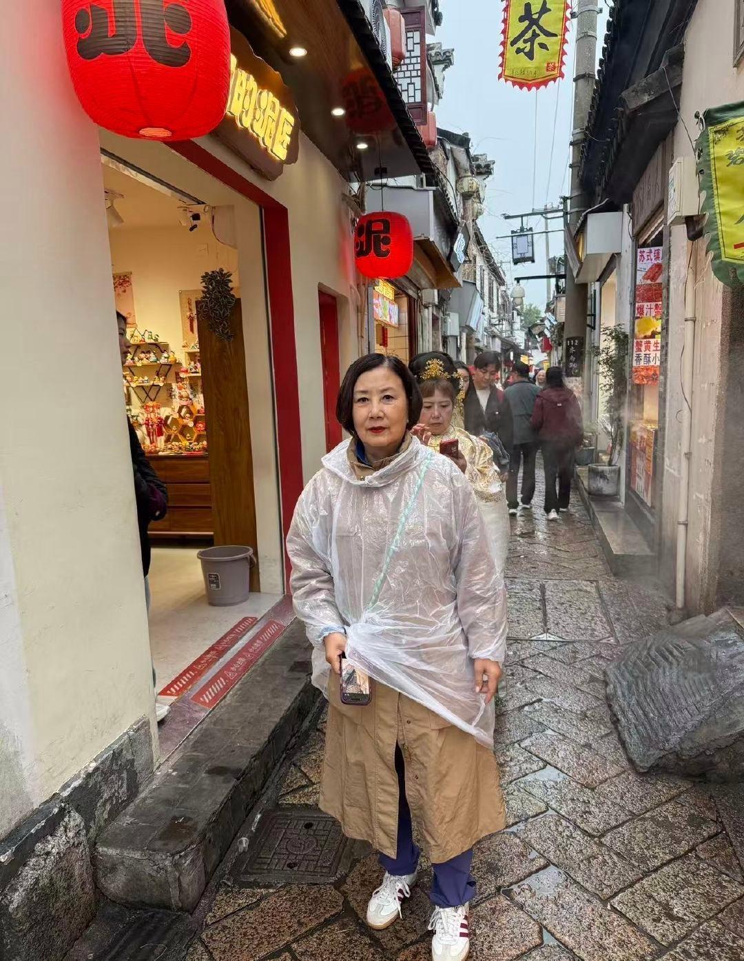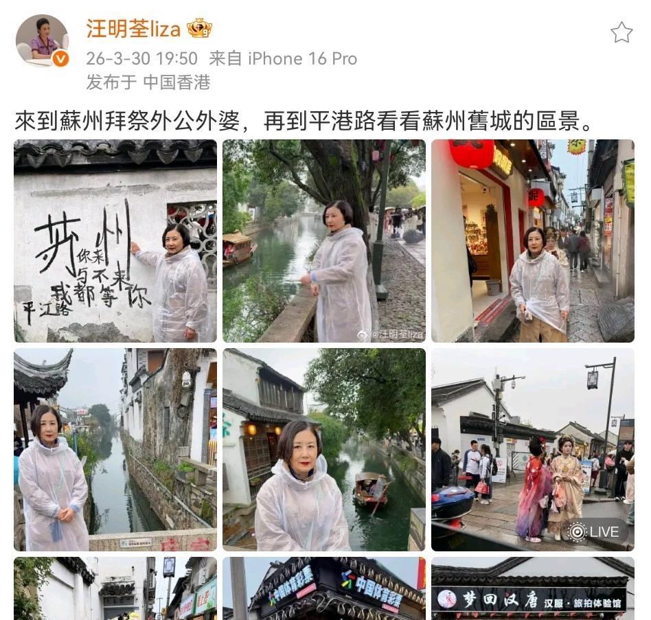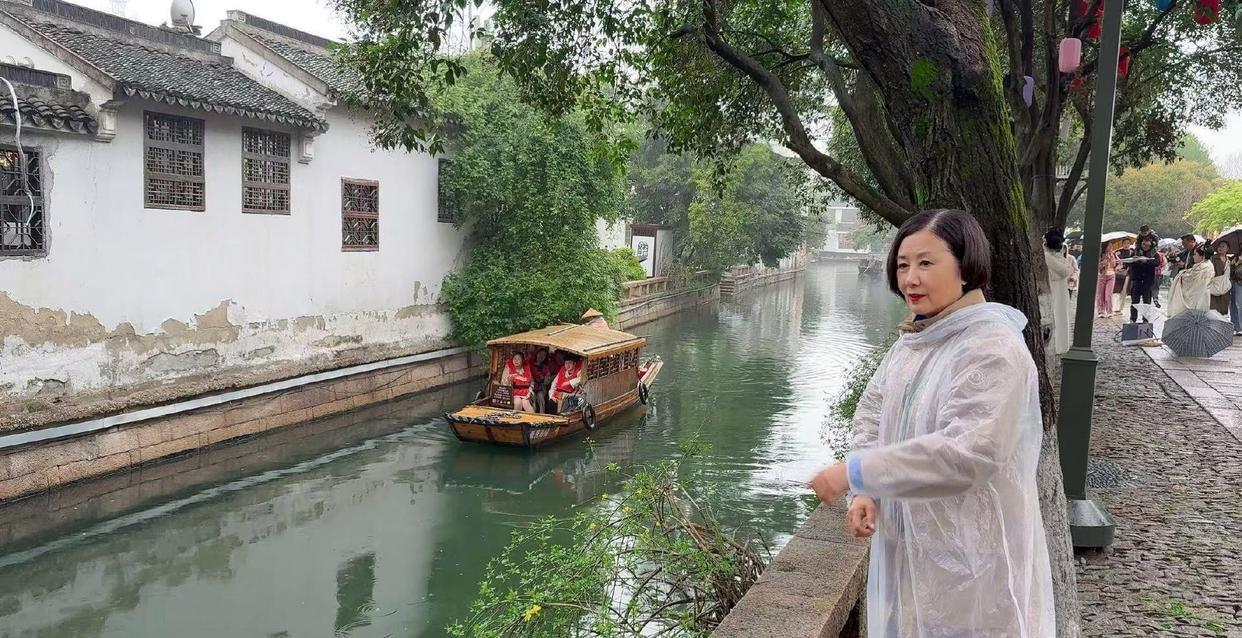 汪明荃现身苏州,穿着雨衣探古镇,展现别样风情。不得不说,汪明荃的这个雨衣造型,与