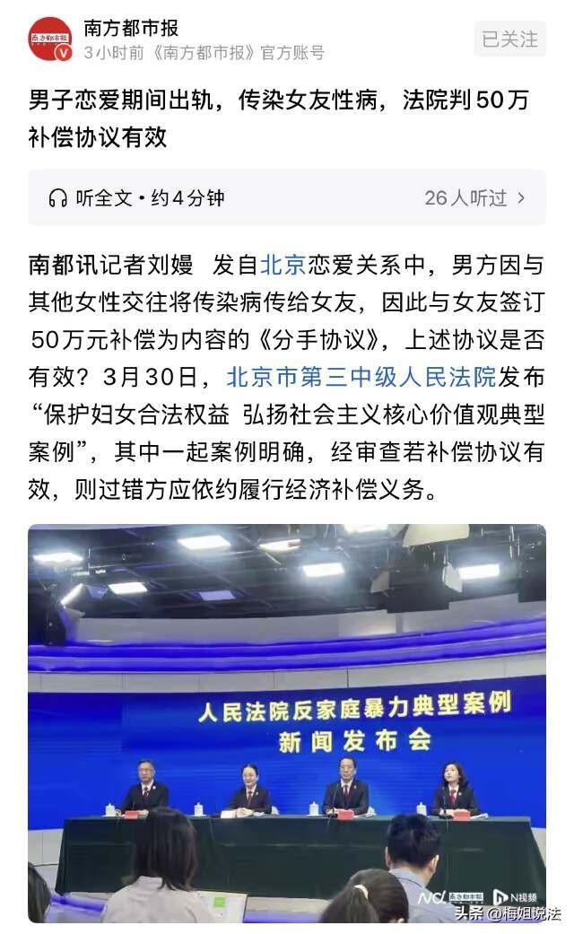 北京,一男子跟女友谈恋爱期间,心怀不轨,内心还惦记其他女性,并且背着女友跟外面的女子发展了亲密的关系。没想到外面的这个女子私生活很差,她本身带有传染病,在发生了关系后,又把这个病传给了男子,回头男子再跟自己女友亲密的时候,女友也不幸中招......女子非常气愤,要求男友赔偿自己50万。谁知道,男子只承诺给,却一分钱不肯兑现。 南方都市报3月30日报道了这则新闻。 一男子李某跟女友张某是男女朋友关系,两个人关系还挺甜蜜的。 可是谁知道,暗地里,李某却存了背叛之心,拥有一个女友还不够,他经常背着自己的女友,跟外面的女性聊暧昧的短信。 李某跟外面的女子聊着聊着,还真的就好上了。李某趁自己的女友不注意,背着她,偷偷的跟外面的女子在外面开了房。 在发生了亲密的关系之后,这个外面的女子才告诉李某一个事实:自己感染了男女相欢之后的那种病,并且还具备传染性。 这个消息被李某得知之后,他一整个震惊了! 没多久之后,李某正式确诊了这个传染病,而对于这个情况,他丝毫不肯告诉给自己的女友,因为他不希望女友知道,他已经背叛了她。 回头,李某还正常的跟张某交往,二人也是正常的进行亲密的行为。可女友张某根本就不知道,自己的男友,如今是个传染源。 后来,张某身体也开始出现了症状,去医院一检查才得知,自己感染了那种传染病。 张某怎么也想不通,自己私生活非常健康、稳定,怎么可能会有这种情况发生呢? 这一刻,她联想到自己的男友李某,回去一问,李某架不住询问,全都招了。 张某怎么也没有想到,自己遭遇感情的背叛就算了,还被自己的男友给感染上了传染病,这可如何是好呢?以后,她的人生都要对自己的健康担忧。 张某怎么都不肯原谅李某,她准备跟李某签订一份协约,《分手协议》,内容约定为:由于李某在跟张某谈朋友期间,跟其他的女子约会,导致自己感染上传染病,让自己身体遭受伤害。经约定,李某需要对张某做出经济补偿,合计50万元,每年打款5万,分期10年还清。 在签订妥善之后,双方也都签字了。 可是,一直到协约到期,这个李某居然一分钱都没有给到张某,张某就立刻把李某给上诉了,要求他一次性给付50万元,并且还需要支付利息。 这个不负责任的李某开始辩称:协约的内容不真实,并不是自己自愿签订的,而且50万元,并非赔偿费,就是个“分手费”。 面对李某的辩解,张某瞬间就感觉,这个男人真的不负责任。 那么,相关部门是怎么判定的呢,会站在“渣男”这一边吗? 实则不然。 相关部门在裁判的时候认为,李某跟张某签订协约的时候,具备相应的民事行为能力,而且协议就是李某亲自书写,还有签字,还有手印,已经具备生效的要件。 另外,李某说自己被胁迫,不知自愿,但是他又拿不出证据。而且在签订协约之前,李某确实犯错了,并且还对张某的身体造成伤害,因此李某也应该拿出一定的经济补偿。 最后,这份协约并没有违背公序良俗,也不存在说是“分手费”一说,因此李某辩称合同无效,不应该给予采纳。 最后判定,协约有效,李某应该按照协议履行义务,需要一次性给付50万元给到张某、并且支付逾期利息。 男子故意隐瞒自己背叛感情的事实,不慎感染疾病,之后又把病症传染给女友,他这个行为就是违法的,已经构成侵权。 根据《民典法》第一千一百六十五条规定,行为人因为过错侵害他人民事权益造成损害的,应该承担侵权责任。 男子感染了男女之间的传染病直接影响到女友的身体健康,后期女友可以找他索赔,治疗费用、心理创伤、误工损失等,都属于可以索赔的范围。 当然,不一定非要走诉讼,据《民典法》规定,双方愿意协商处理,就可以签订书面的补偿协议,这也是一种比较高效的解决方式。 正如张某健康权被损害之后,跟男友签订了协议,约定每年支付一定的赔偿金,只要双方是处于自愿、内容合法,相关部门就会予以支持。 恋爱的维系,建立在平等、尊重和互相负责的基础上,不管是恋爱期间,还是同居期间,应该恪守基本的道德准则,不可以损害对方的人身健康权。 对此,你怎么看呢?