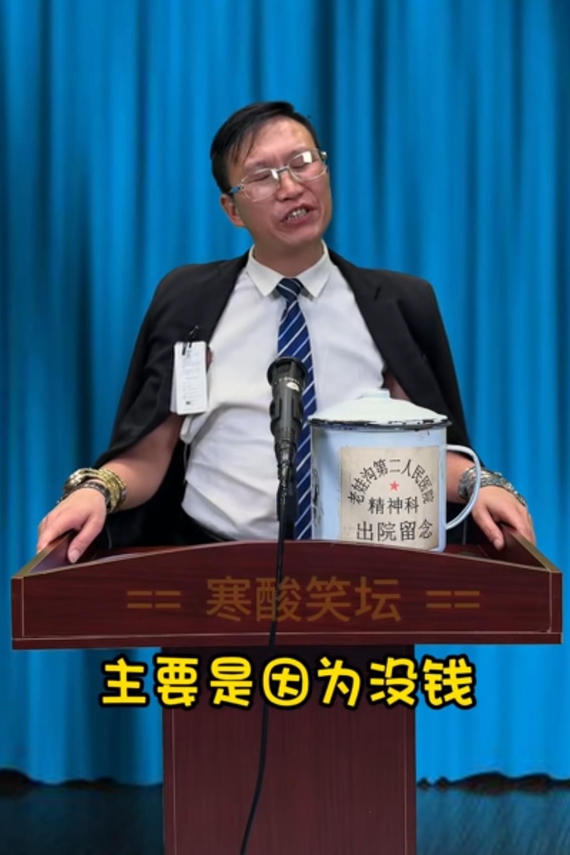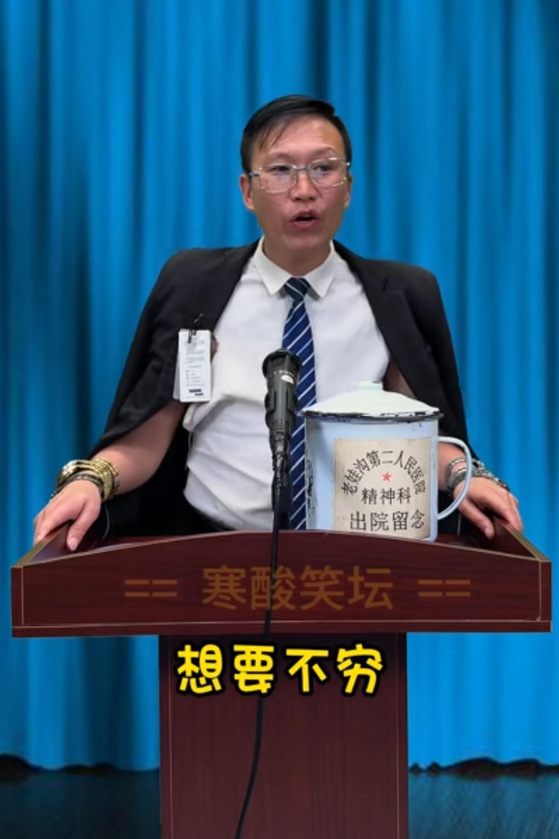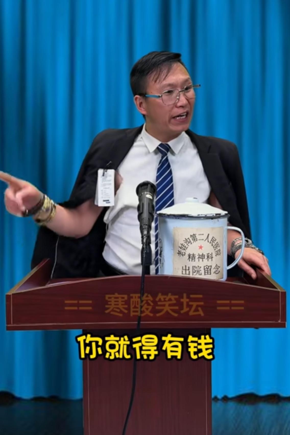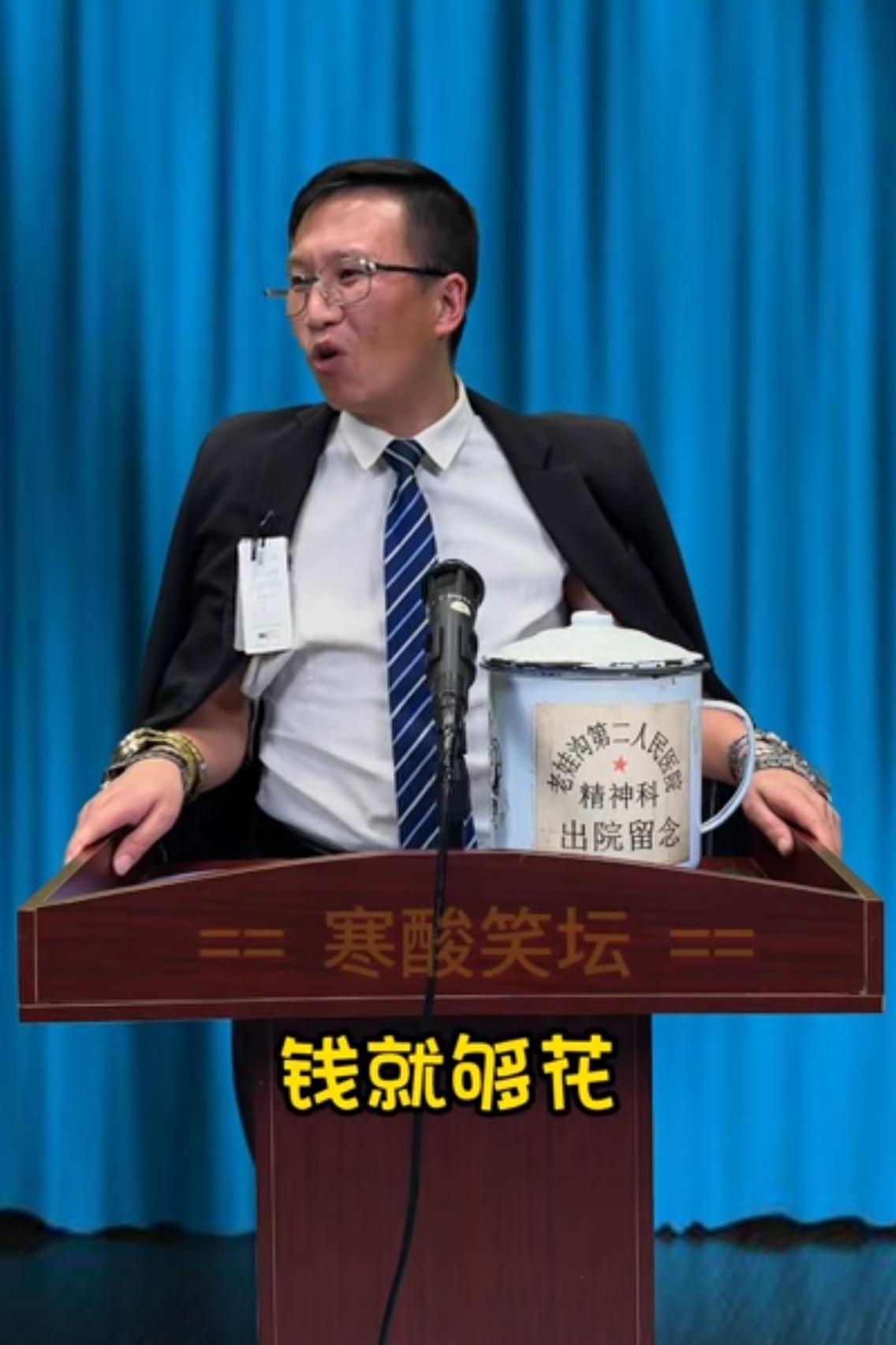 他说的话,你可千万别信!因为看讲台上的大茶缸子上印着精神病科!不过他说的似乎还真是那么回事,哈哈哈…… 这个家伙说:研究发现,只要不花钱,钱就够花。贫穷的根本原因,主要是因为没钱。因为人一旦有钱,意味着不穷,那不穷呢,就说明有钱。因此呢,想要不穷,你就得有钱!