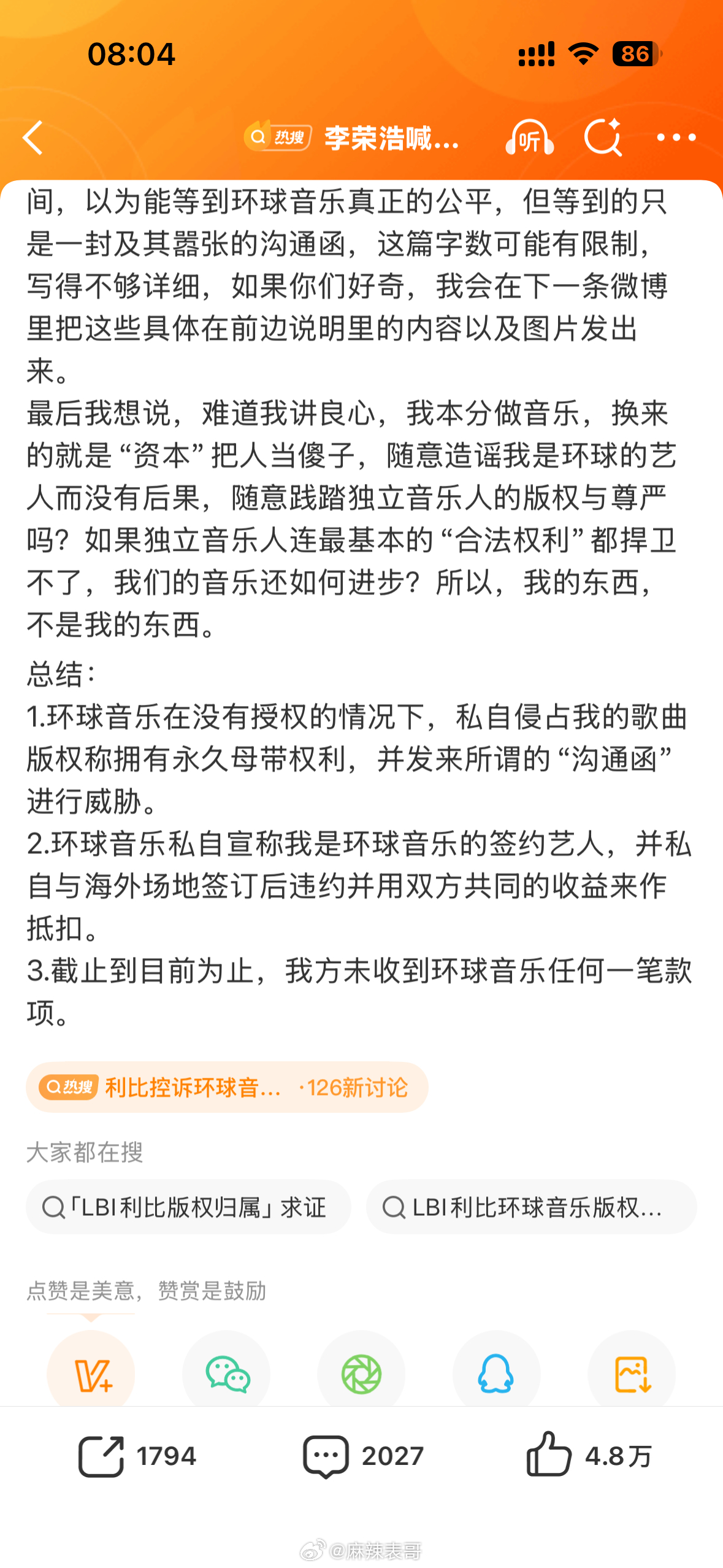 此前,因为合同纠纷撕李荣浩的吴向飞,纠纷公司也是环球。