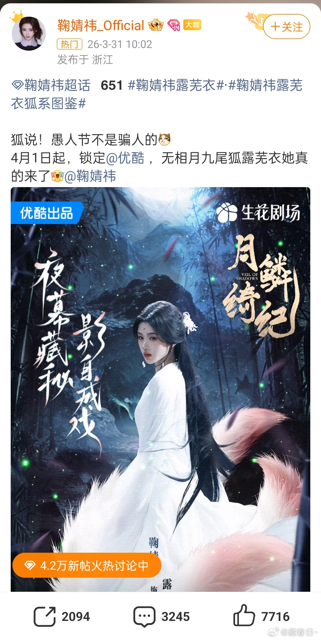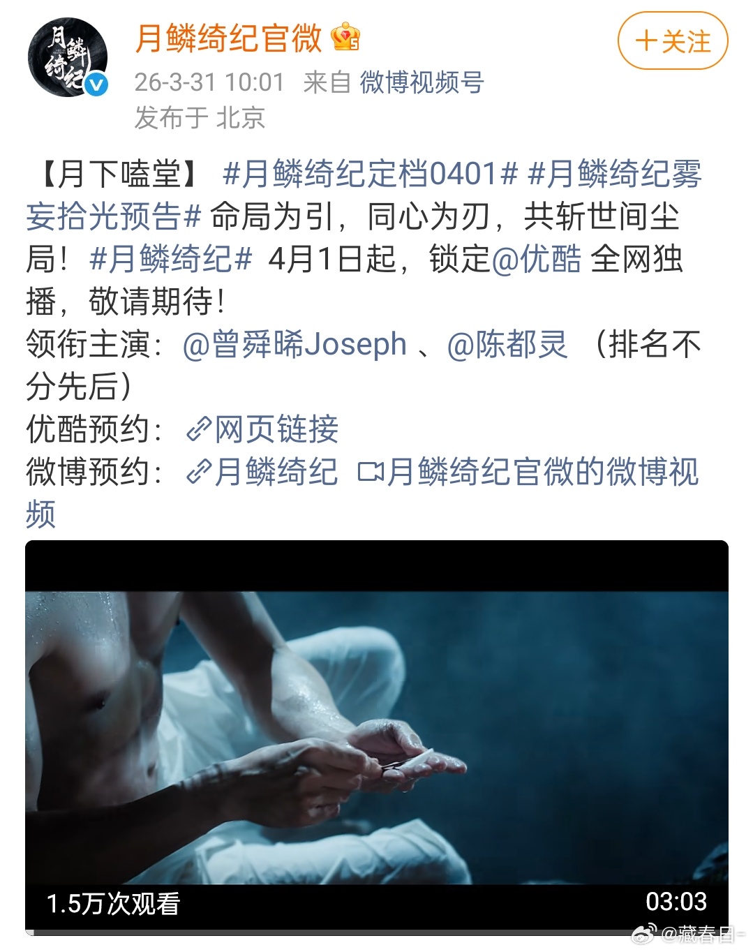 鞠婧祎播剧月鳞绮纪定档了,明天播,预告也有了,鞠婧祎自己还上线发了宣传博,我想看