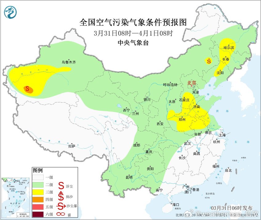 从今晨空气质量看,黑龙江大庆、吉林松原、长春出现重污染。此外山西、山东、安徽等地有轻度污染,上述地区对应有霾。今天东北、黄淮等地霾持续。明天东北因为有冷空气影响,霾有望结束。黄淮的霾在明后天可能还会有些。另外4月2日-3日,蒙古有低压气旋发展东移,将引发北方一轮大风沙尘过程。