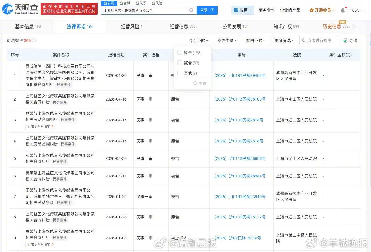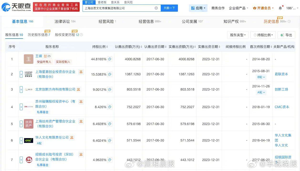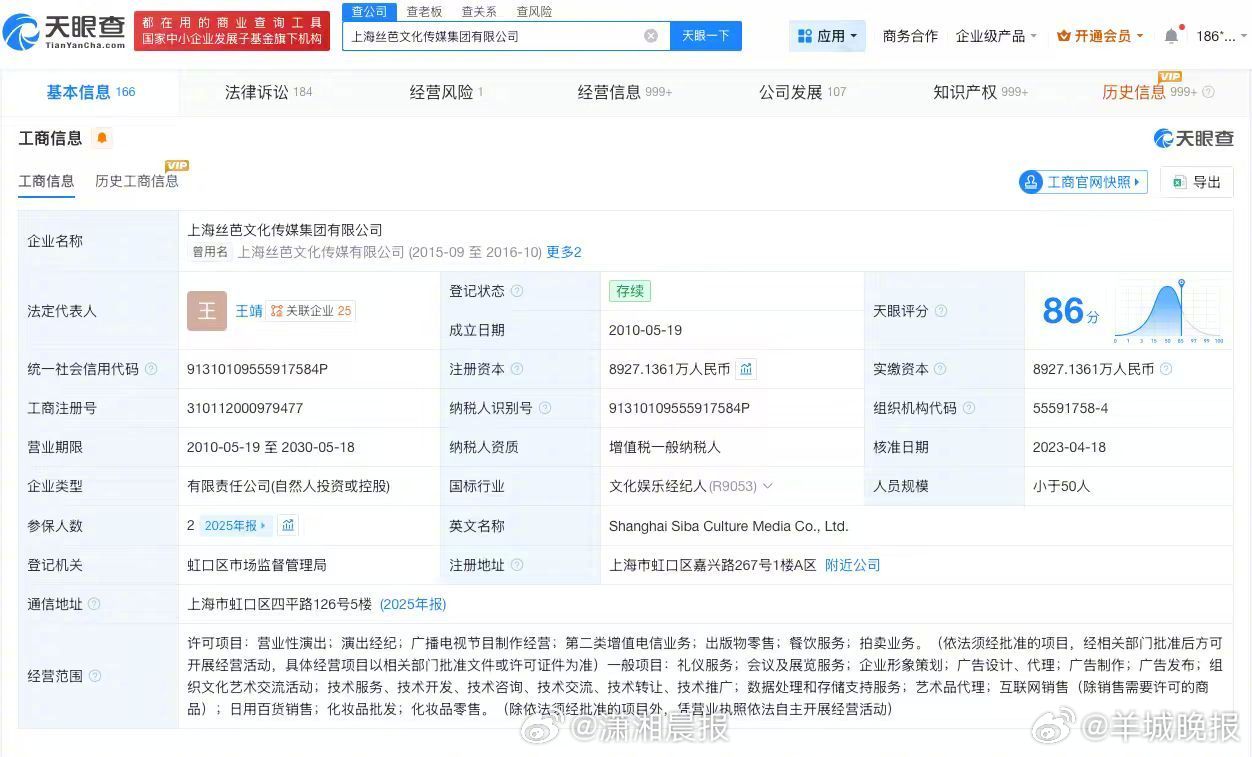 【#丝芭传媒涉及不正当竞争纠纷#】据媒体报道,近日,丝芭传媒向国家税务总局上海市税务局稽查局实名举报鞠婧祎涉嫌偷税漏税。记者查询天眼查发现,丝芭传媒关联公司上海丝芭文化传媒集团有限公司成立于2010年5月,法定代表人为王靖,注册资本约8927万人民币,经营范围包括营业性演出、演出经纪、广播电视节目制作经营等。股东信息显示,该公司由王靖、上海星澈创业投资合伙企业(有限合伙)、北京创新方舟科技有限公司等共同持股。法律诉讼信息显示,该公司涉及多起司法案件,案件身份多为原告,案由包括合同纠纷、不正当竞争纠纷、劳动合同纠纷等。行政处罚信息显示,2025年12月,该公司因未经批准擅自从事出版物的出版业务,被上海市虹口区文化和旅游局罚款1万元。此外,上海丝芭文化传媒集团有限公司现存多则股权冻结信息,被执行人包括该公司、王靖等。 (潇湘晨报)更多消息:#鞠婧祎被实名举报偷税漏税##鞠婧祎 丝芭##月鳞绮纪定档##鞠婧祎 收入明细##AI短剧 偷脸##音著协回应单依纯侵权唱李白##丝芭传媒近期被罚#(编辑:惠天骄;审签:谢杨柳)