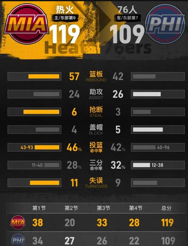 看完这场球,我真替76人臊得慌。 都说希罗30分真猛?那是障眼法!热火119-109啃下76人,真不是靠他一个人浪投,是靠阿德巴约在内线当牛做马,把恩比德啃得骨头渣都不剩。 开场那会儿,我以为76人"三巨头"得把热火这堆落选秀生吞活剥了。恩比德三分一扔,马克西蝴蝶穿花,乔治大爷闲庭信步——好家伙,这阵容看着就"手拿把掐"对吧?结果呢?被阿德巴约一个人搅和了。 您看巴姆那哥们儿,上半场3中3的三分,这叫"以彼之道还施彼身"——你恩比德能拉出去投,我凭啥不能?但更狠的在后头。第四节关键时刻,恩比德累得跟老牛似的,喘气都带哨音;阿德巴约呢?23分16篮板6助攻,最后还能从恩比德脑瓜顶上摘板,传出一记妙到毫巅的助攻。这活儿累不累?您试试跟300斤的大汉肉搏48分钟,还得兼顾发牌、补防、卡位,这叫"铁人三项"篮球版。 希罗那两记"瞎扔"三分确实救命,可您细想:没有阿德巴约前面死扛,希罗哪来的出手空间?最逗的是维金斯,14分8篮板,场上跟"隐形人"似的,热火花大价钱换他过来,结果他在底角"养生"呢。这要是不醒,季后赛真走不远。 76人那边?马克西23+7+9,乔治19分,恩比德26分,数据都光鲜着呢。但第四节最后五分钟,球在谁手里?恩比德要低位,马克西要突破,乔治要单打——仨人仨主意,愣是让热火的落选秀把胜利偷走了。这叫什么?这叫"三个和尚没水喝",豪华阵容打出了野球场的既视感。 说白了,篮球不是堆球星就能赢的。阿德巴约正值当打之年,一个人干五个人的脏活累活;那边三位大佬各怀心思,关键时刻"脑血栓"发作。这场球看完,我算明白了:天赋能带你进季后赛,但想赢球,得有人肯当"牛马"。 热火的胜利,是一群"不被看好的人"用血汗换的。这,才是竞技体育最治愈的地方。