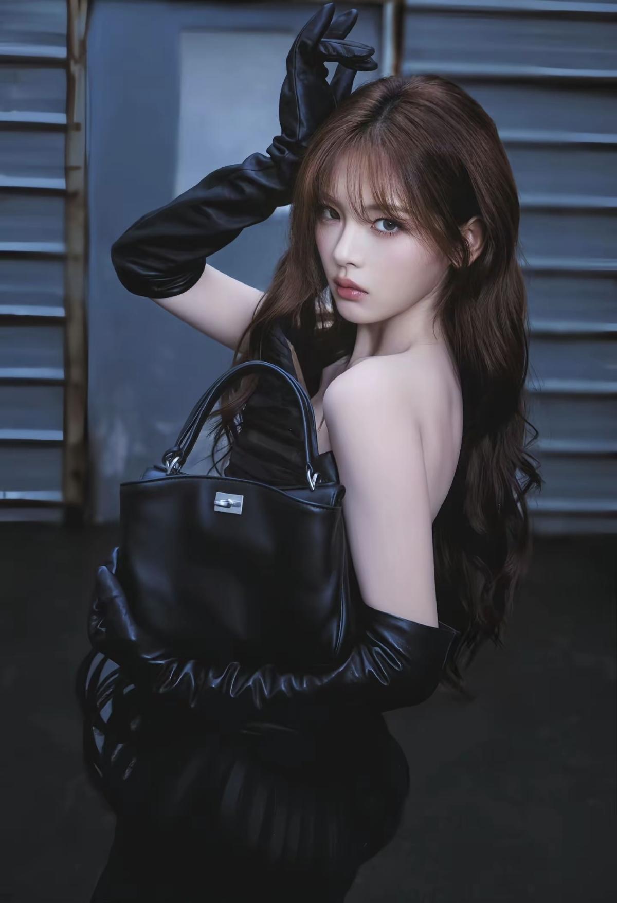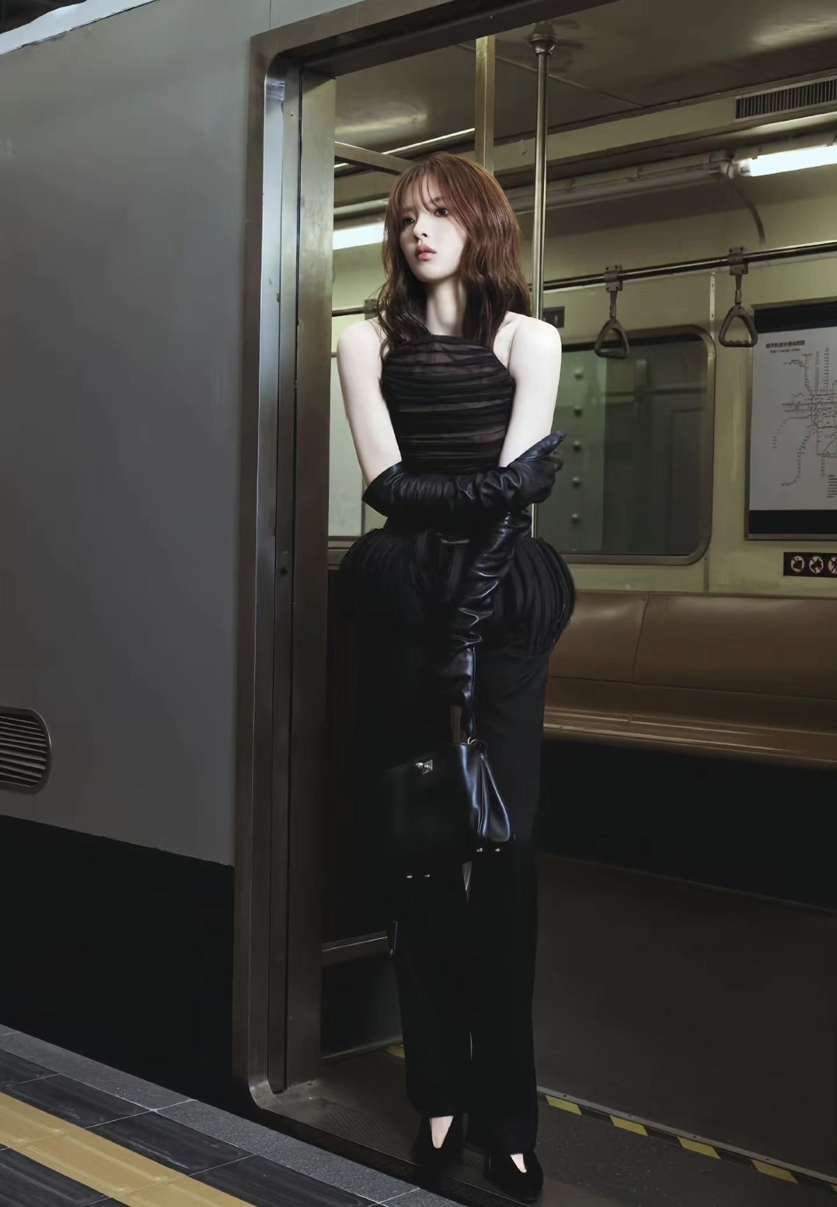 杨超越这组黑色系写真太杀疯了[比心] 抹胸褶皱上衣搭配高腰阔腿裤, 长皮手套加持