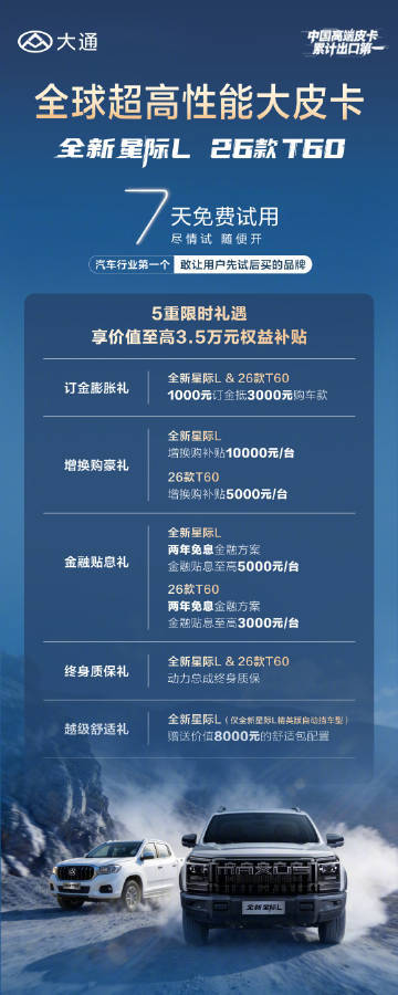 上汽大通皮卡达成40万台下线,全新星际L推出**7天免费深度试用**,告别短程试驾,可跑烂路、拉重货,真实场景体验满意再下单,尽显品牌对产品的底气。