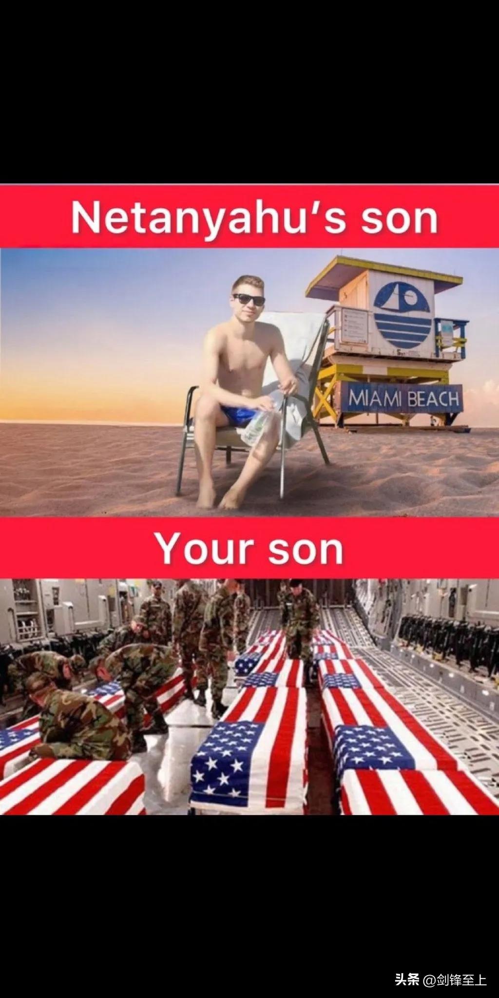 据说下图在美国网络上很火 图片上半部分是: 以色列总理的儿子在美国迈哈密沙滩度假 图片下半部分是: 你的儿子躺在棺材里,(也就是美国老百姓你的儿子在棺材里) 通过这个图也能看出部分美国人不愿意为以色列卖命,认为这场战争是美国为了以色列的利益