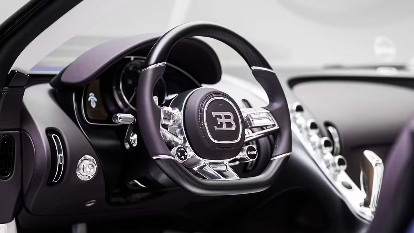 内饰匠心:浅深双色皮革+紫色点缀+碳纤维营造统一氛围数千针复杂刺绣呈现动态花卉图案(头枕对称构图、门板花瓣如风流动)换挡杆内嵌品牌创始人之弟伦勃朗·布加迪经典雕塑"舞动的大象",置于定制染色玻璃中,连接艺术传承与现代工艺