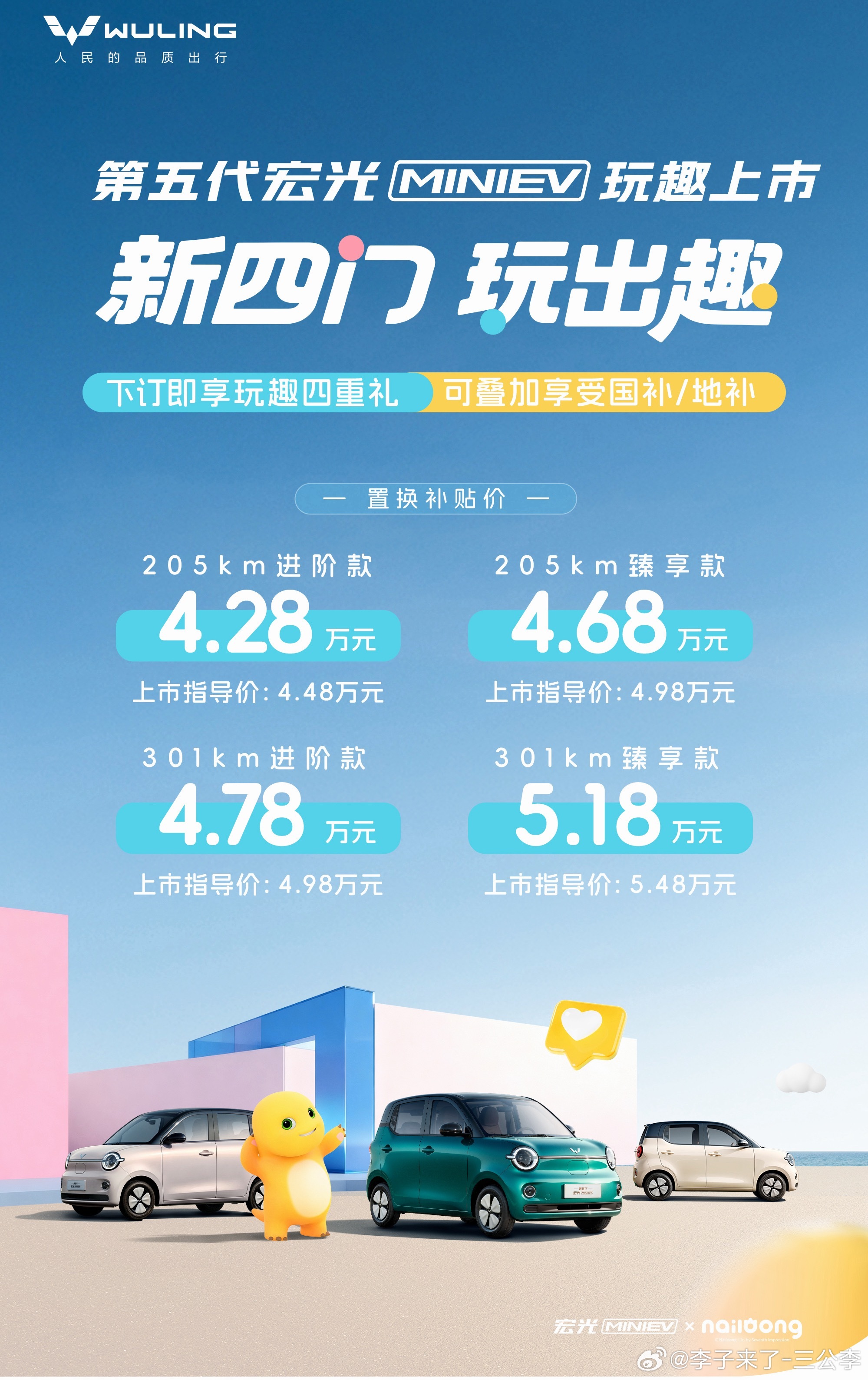 家人们!五菱第五代宏光MINI EV终于在3月27日上市了,这次真的不一样!它全系升级成了四门四座,后排进出更轻松,后备厢也更大了。外观采用全新“甜趣方糖”设计,还有绿悠悠、白绒绒等三种超可爱的珠光配色,质感拉满。续航有205km和301km两种CLTC版本,日常通勤和周末短途都够用。内饰配10.1英寸大屏,支持多应用互联,还自带露营、小憩、宠物四种场景模式,特别有氛围。价格方面,官方指导价4.48万-5.48万元想花小钱买辆好开、好看的日常代步车,这款真的可以冲!第五代宏光MINIEV42800元起玩趣上市