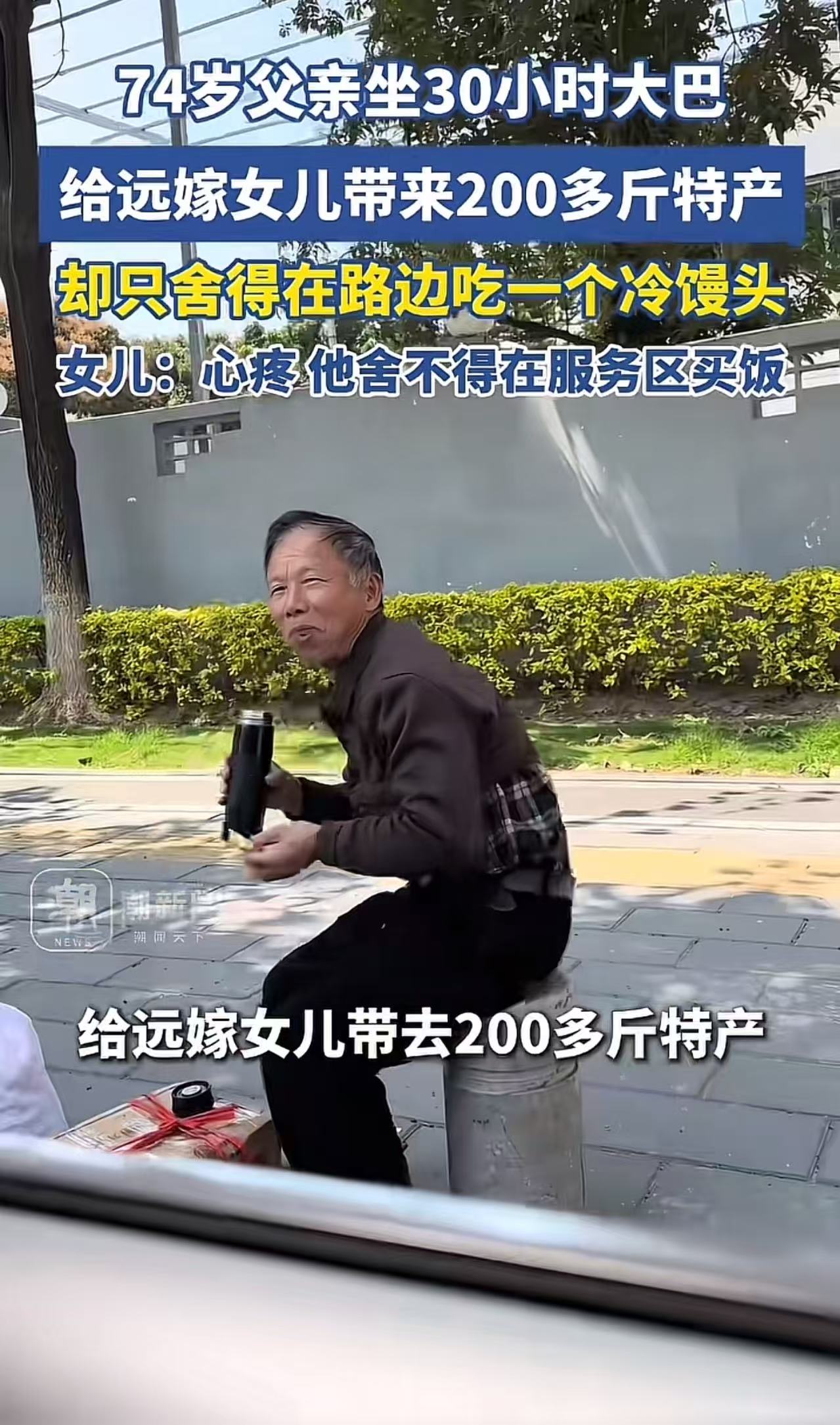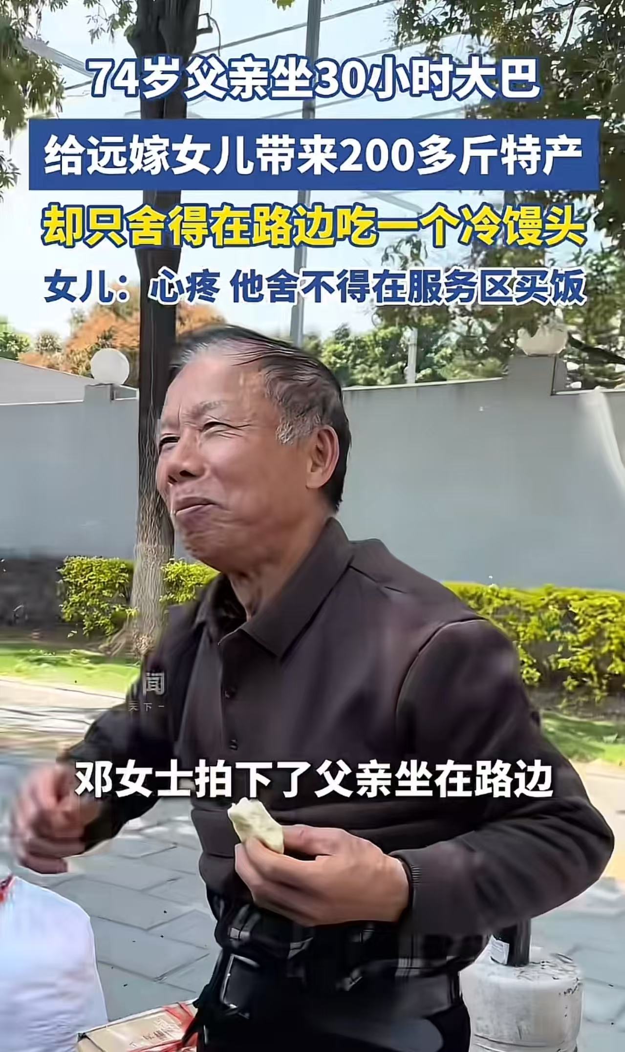 这一幕看哭多少人!74岁父亲坐30小时大巴,给远嫁女儿带来200多斤特产,却只舍得在路边吃一个冷馒头。女儿:“很心疼,他舍不得在服务区买饭。”网友:多么沉重的父爱,远嫁最对不起的就是自己的父母!