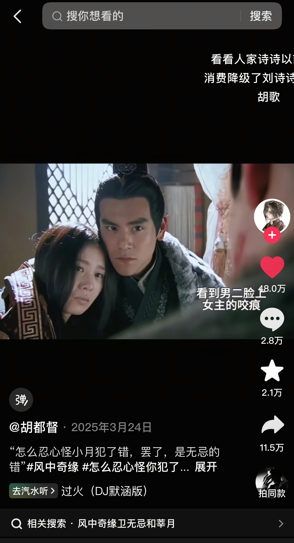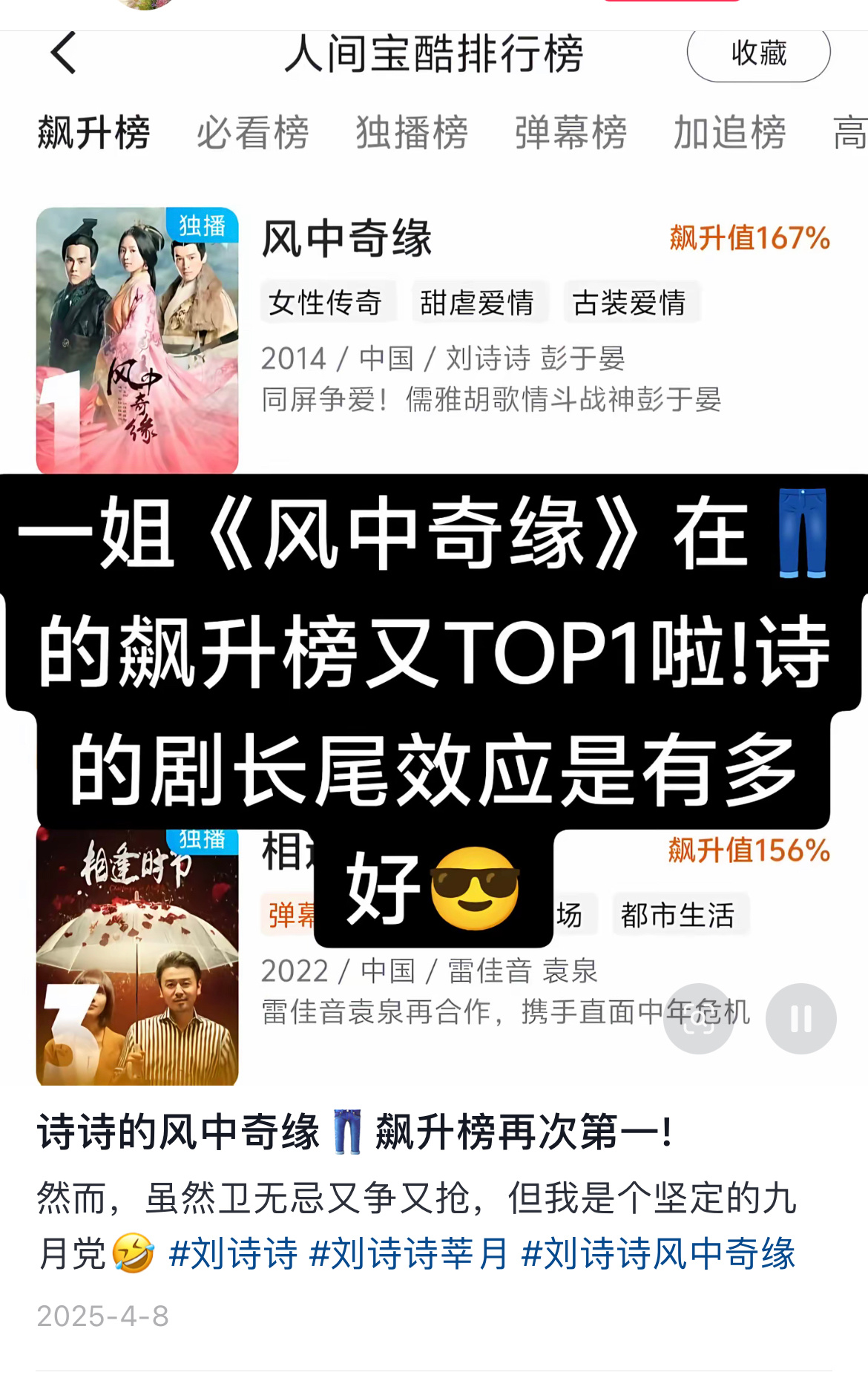 最近《风中奇缘》又双叒叕翻红了!每隔几个月就火一次的养老剧,12年了还在被考古、二创、刷屏,刘诗诗真的不靠一时流量,靠作品说话,《仙剑三》《怪侠一枝梅》龙葵,燕三娘17年仍在跨代圈粉,《步步惊心》全球爆、反复重播,二创刷屏,《女医明妃传》《流金岁月》《一念关山》《掌心》《淮水竹亭》等播完热度不减,部部长尾。每一部都能成为经典,每一个角色都能被记住这才是演员最牛的「长尾效应」永远可以相信刘诗诗的选剧眼光和演技