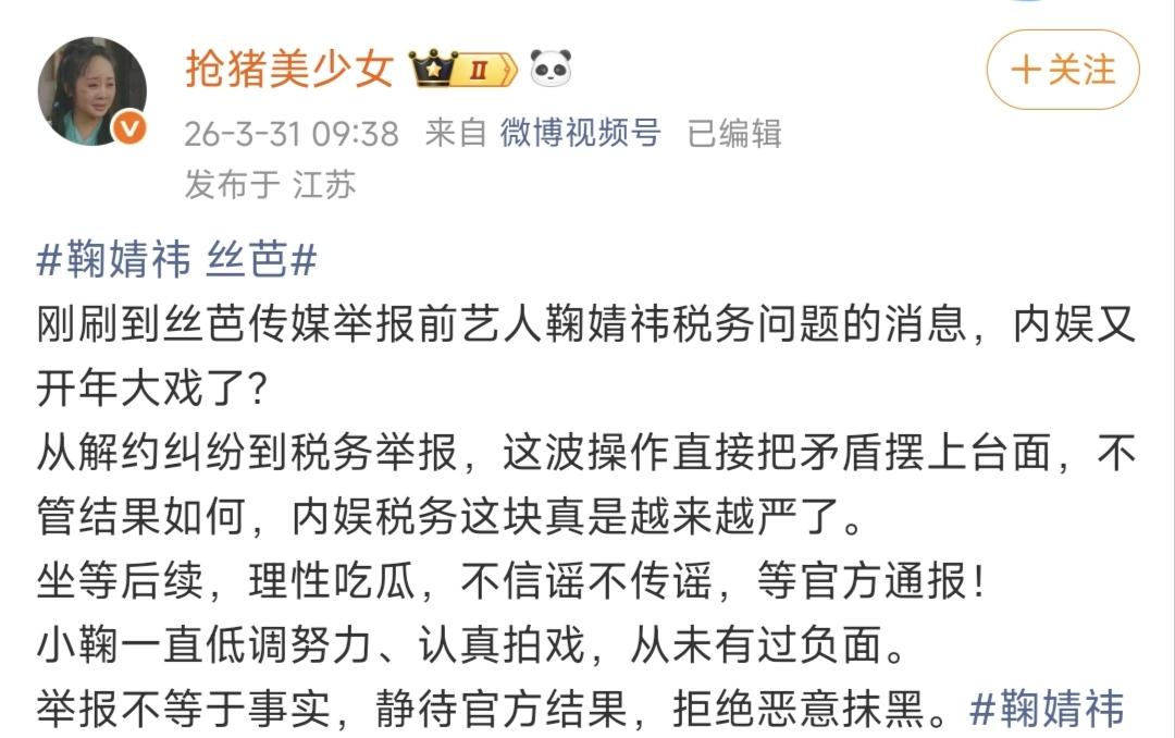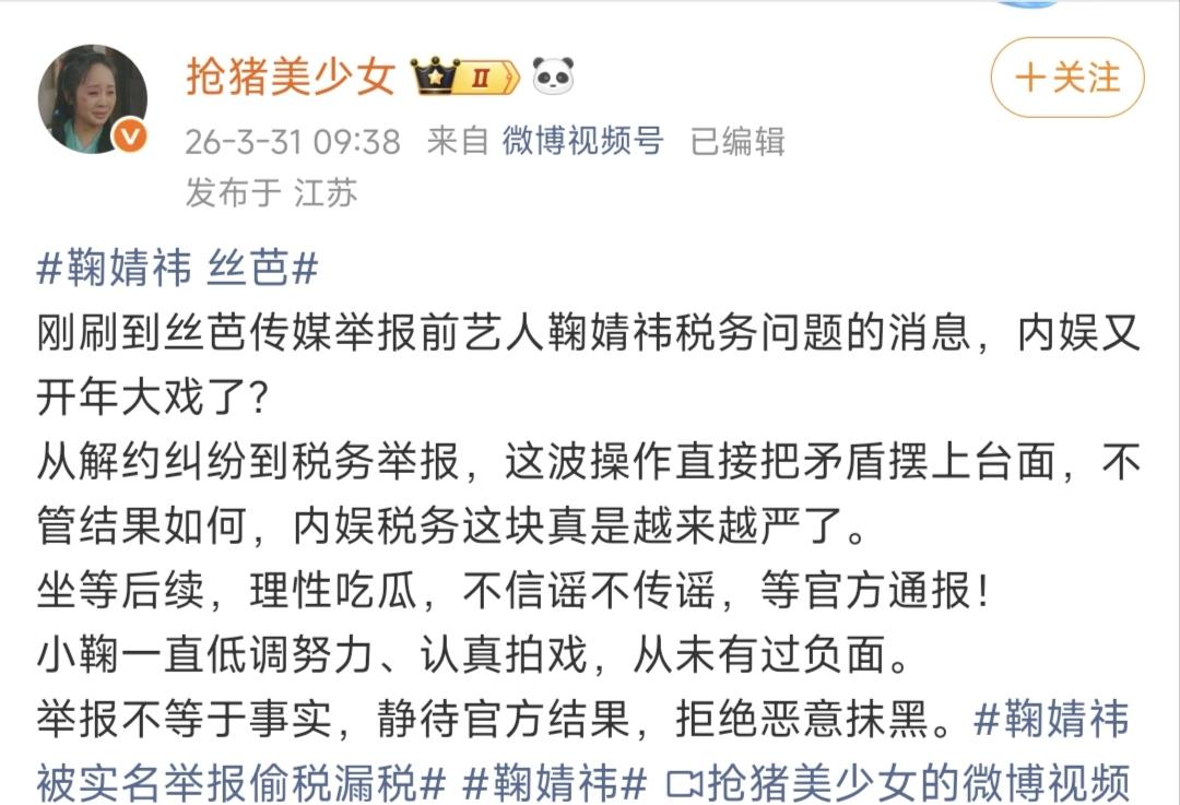 丝芭鞠婧祎彻底撕破脸!实名举报税务瞒报近88%,内娱炸锅了! 3月31日,内娱又炸出惊天大瓜! 丝芭传媒实名举报前艺人鞠婧祎税务问题,直接把双方的矛盾彻底摆上了台面,这到底是怎么回事呢? 原来,这次的举报内容堪称重磅。 有爆料明确提到,丝芭实名举报鞠婧祎税务申报仅1100多万,可实际收入却高达5000多万,瞒报比例将近88%。 消息一出,瞬间在网上掀起轩然大波。 不少网友直呼离谱,从之前的解约纠纷到如今的税务实名举报,这波操作直接把双方的矛盾彻底摆到了明面上,也难怪大家感慨,内娱税务这块果然是越来越严了。 也有很多观众和网友直呼意外,感慨丝芭竟然已经做到这步了。 现在所有人都在等鞠婧祎方的正式回应,毕竟她手里还有好多待播剧,一旦事件有实锤,后续的影响不可估量。 当然,也有不少网友保持理性,表示举报不等于事实。 大家纷纷留言,要理性吃瓜,不信谣不传谣,一切静待官方通报和双方的正式回应,拒绝无凭无据的恶意抹黑。 也有粉丝表示,鞠婧祎一直低调努力、认真拍戏,从未有过相关负面,静待最终结果。 不得不说,税务问题一直是内娱不可触碰的红线,多少艺人因为税务问题断送了演艺生涯。 从合作多年的老东家,走到如今实名举报的地步,不管最终结果如何,对双方来说,都注定是一场两败俱伤的局面。 你怎么看待这次丝芭举报鞠婧祎的事件?你觉得后续会有怎样的发展?