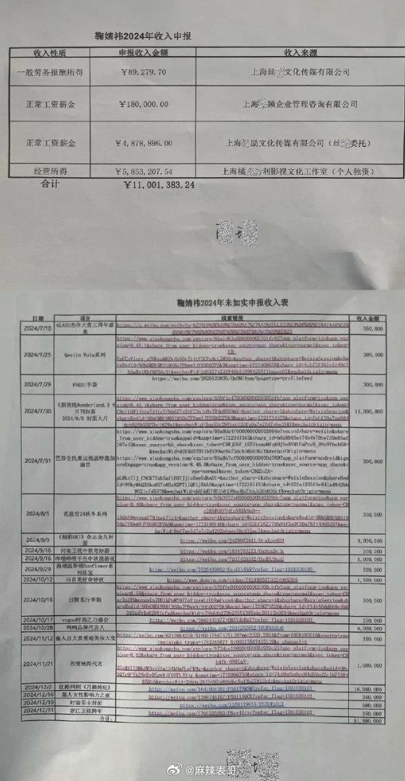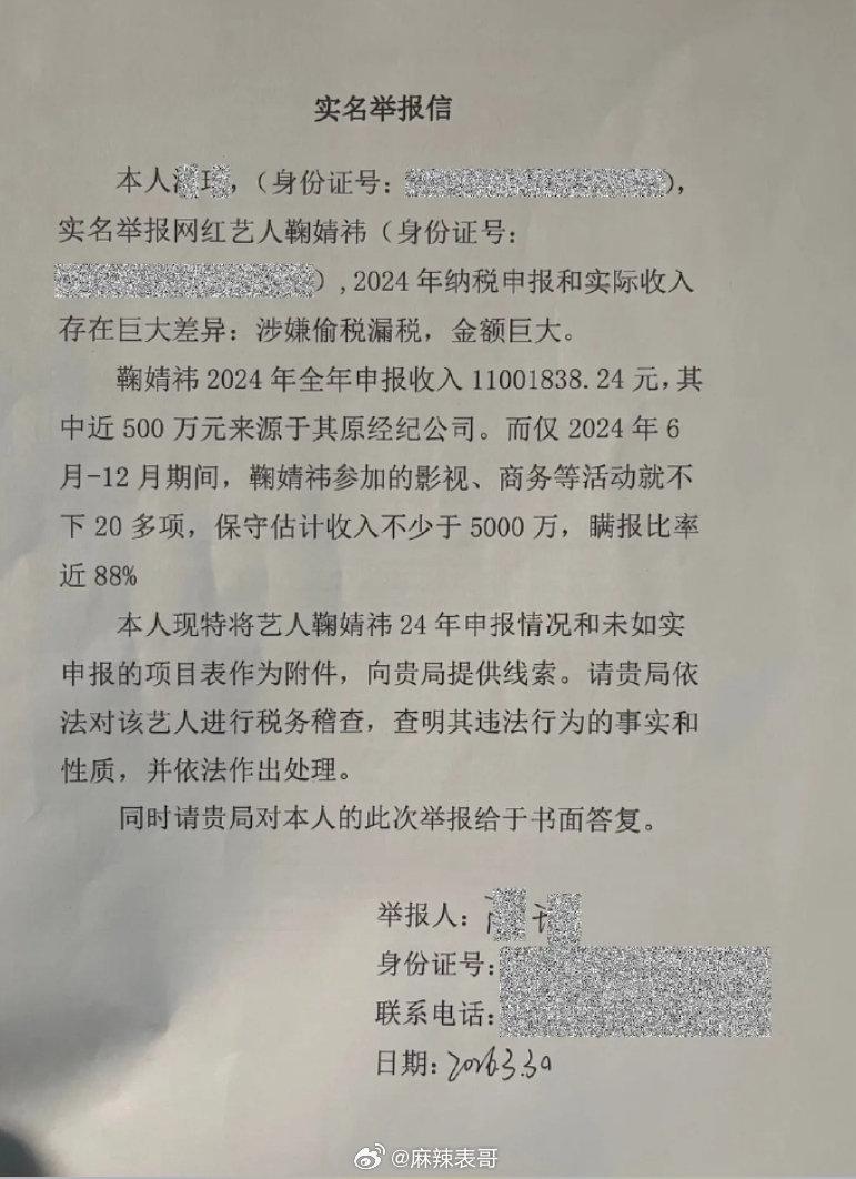 鞠婧祎炸锅!被实名举报税务瞒报88%,千万杂志酬劳引质疑! 3月31日,鞠婧祎主演的《月鳞绮纪》前脚刚传定档,后脚就炸出惊天大瓜! 被前东家丝芭传媒实名举报税务问题,上海税务机关已受理此案,这到底是怎么回事呢? 原来,这次的举报内容堪称重磅,丝芭还拿出了详细的收入明细佐证。 举报材料显示,鞠婧祎2024年全年申报收入约1100万元,可当年仅6-12月,她参加的影视、商务等活动就有约20项,估算收入不低于5000万,瞒报比例将近88%。 更让人咋舌的,是明细里曝光的收入构成。 单一部《月鳞绮纪》的片酬就高达1600万,一本杂志的收入就有1100万,大型晚会一场百万起步,普通活动一场也有30-50万。 不少网友看完直呼,明星拍杂志比拍戏还赚,这来钱也太容易了,不知道中间有没有什么猫腻。 可这份举报明细,也引来了不小的争议。 有网友扒出,这本被举报收入1100万的杂志,实际总销售额才900万,主办方不可能不分成,让鞠婧祎全拿走,纷纷质疑丝芭有夸大收入的嫌疑。 也有粉丝提出,举报的2024年下半年收入,当时鞠婧祎已经脱离丝芭成立个人工作室,公司早已把自己撇干净了。 其实,丝芭和鞠婧祎的矛盾,早就不是一天两天了。 此前双方就因解约纠纷闹得沸沸扬扬,丝芭还曝光过鞠婧祎的艺人待遇,不仅给过亿的定制剧和收入,每月还有25万固定工资,连个人旅游开销都能公司报销,还多次劝诫外界别与鞠婧祎合作,只是收效甚微。 不得不说,这次的事件,也撕开了内娱最现实的遮羞布。 明星拍一部戏、上一本杂志就收入上千万,来钱如此容易,却还要触碰税务红线,也难怪网友们纷纷喊话严查,斥责明星捞钱容易却不老实缴税。 如今事件还在发酵,鞠婧祎和剧方依旧照常官宣新剧定档,尚未对举报事件做出正式回应。 所有人都在等最终结果,毕竟她手里还有多部待播剧,一旦税务问题查实,影响不可估量。 税务问题从来都是内娱不可触碰的红线,从合作多年的老东家,走到如今实名举报的地步,不管最终结果如何,都注定是两败俱伤。 一切还要等税务部门的官方通报,不信谣不传谣,静待最终结果。 你怎么看待这次的举报事件?你觉得明星高收入却偷税漏税该重罚吗?