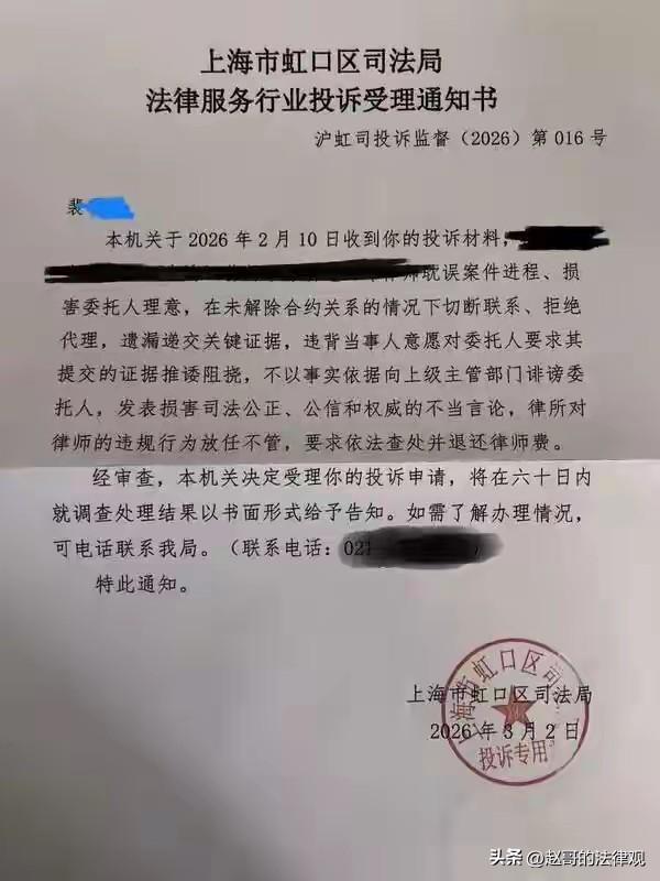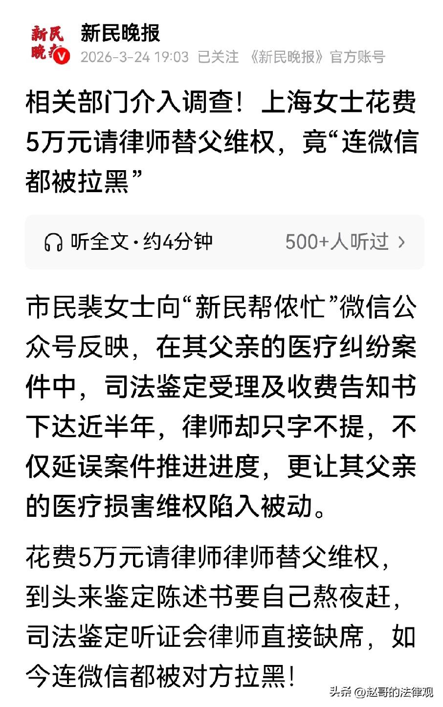 必须严惩!上海,女子70多岁的父亲突发急症,送医院急救,可手术后老人意识模糊、生活完全不能自理了。女子认为,医院在诊疗过程中存在严重问题,于是决定打官司,替为父亲讨个公道。她找了一家律师事务所,委托这家律所,代理这起医疗损害纠纷案,并支付了5万元律师代理费。不料,律师却什么也没做,严重到无故缺席听证会,女子找律所讨说法,却发现已经被拉黑,女子愤而投诉,要求全额退还律师费,不料,后续发生的事让她更加气愤。 裴女士的老父亲,至今躺在病床上,生活无法自理,她也因此和医院发生了纠纷。 而她聘请的律师,却玩起了失联,5万块钱的律师费也打了水漂。 2024年,裴女士70多岁的老父亲突发急症,被送进医院抢救。 谁曾想,一场手术下来,老人不仅没好转,反而意识模糊、说不出话,右边身体瘫痪,彻底失去了自理能力。 裴女士认为,医院在手术方式的选择,和术前风险评估上,存在明显问题。 为了给父亲讨个说法,她决定走法律途径。 2024年11月,裴女士找到一家律师事务所,签了委托代理协议。 她一次性支付了5万元律师费,委托对方全权处理,这起医疗损害责任纠纷。 合同上表明律师的义务包括:审阅文件、提供法律意见、起草相关文书等等。 裴女士当时觉得,把钱和专业的事交给专业的人,心里总算有点底气。 可接下来的事,完全偏离了她的预期。 医疗纠纷案件里,司法鉴定听证会,是决定性的环节。 而提交给鉴定专家的“鉴定陈述书”,就好比患方的“申诉状”,至关重要。 裴女士深知这一点,从2025年上半年立案后,她就多次催促律师,要抓紧准备这份材料。 可每次问,律师都不急不忙,用“急什么,可能会被退件”、“还没通知”之类的话搪塞她。 关于陈述书怎么写,律师从来没跟她商量过,更没拿出过任何草稿。 日子一天天过去,裴女士心里越来越不踏实。 直到2025年12月底,她依然没从律师那儿,听到任何关于听证会的消息。 她坐不住了,只好自己打电话,到司法鉴定机构去问。 这一问,裴女士气炸,鉴定机构早在2025年8月,就发出了受理及收费告知书,鉴定程序早就启动了! 可她的代理律师,却把这消息瞒得死死的,导致案件平白无故停滞了近半年。 这半年里,律师对听证会的筹备工作,什么都没做。 然而,更离谱的还在后头。 2026年1月27日,这场千呼万唤的,司法鉴定听证会终于召开。 可直到走进会场,裴女士都没见到自己律师的影子。 这位收了5万块钱的代理律师,在如此关键的时刻,竟然无故缺席了。 当时委托协议还没解除,他依然是被委以重任的代理人。 律师指望不上,听证会却不会等人。 被逼到绝境的裴女士,只能在朋友的帮助下,自己连夜翻材料、查资料,硬着头皮赶出了一份鉴定陈述书。 个中艰辛和委屈,只有她自己知道。 事后,裴女士想找律师要个说法, 可电话难打通,微信消息发过去,她这才发现,自己已经被对方拉黑了。 沟通渠道被彻底切断,裴女士又急又气。 早在去年12月,她就曾专门跑到律师事务所去交涉,要求解除合同、退还全部律师费。 但律所方面始终没有给出解决方案。 走投无路的裴女士,只好把律所投诉到有关部门。 投诉原因:律师隐瞒案件重要进展、延误程序、无故缺席听证会、拉黑委托人失联等一系列问题。 现在,裴女士一边要照顾病榻上,生活不能自理的老父亲,一边还要为这场艰难的维权四处奔波。 她只想知道,那5万元买来的所谓“专业服务”,到底服务了什么? 而那位收了钱,却“隐身”的律师,最终又会得到一个怎样的处理? 依据《律师法》第48条第2项:律师接受委托后,无正当理由拒绝辩护或代理、不按时出庭参加诉讼或仲裁的,由设区的市级或直辖市的区政府司法行政部门给予警告,可处1万元以下罚款; 有违法所得的没收违法所得;情节严重的停止执业3个月以上6个月以下。 也就是说,律师接受委托后,就应当按照法律规定,和合同约定履行职责。 认真负责地为委托人提供法律服务。 本文中,律师与裴女士签订了委托代理协议,收取了律师费。 就应当履行审阅文件,起草文书等义务,并按时参加司法鉴定听证会。 但该律师不仅隐瞒案件重要进展,延误程序,还无故缺席听证会,事后更是拉黑委托人失联。 根据上述条款规定,该律师可能会面临,司法行政部门的警告、罚款等处罚,若情节严重,还会被停止执业。 目前,当地司法局已正式受理,将依法依规,进行全面核查处理这一事件,还裴女士一个公道。 发生这样的事,人们不禁感叹:连律师都不可信了?