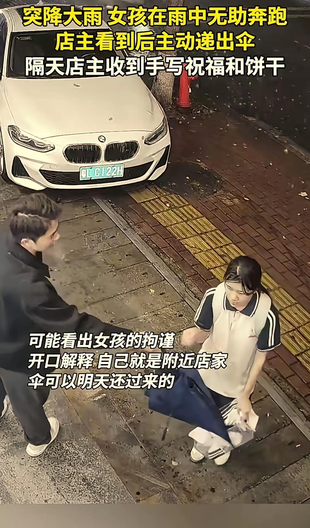 “双向奔赴了!”广东惠州,一店主下雨天,忽然看到一名没伞的女孩在雨中奔跑,他急忙出门将雨伞主动递了过去,女孩不知所措的接过伞,还没等打开,就急忙问怎么送还,店主指了指门口电动车,随后就离开了。没想到隔天不但雨伞被还了回来,还意外收到了一份回礼!   最近广东惠州一场雨天里的小事,刷爆了不少人的朋友圈,没有轰轰烈烈的场面,却让人心里暖乎乎的,就是一件借伞还伞的事儿,但偏偏这份双向的善意,戳中了很多人。   事情发生在惠州的一条街边,店主是个普通的生意人,平时就在店里忙活,为人挺实在,不愿透露太多个人信息,大家平时都喊他老板。   那天下午,天突然变脸,下起了不小的雨,雨点砸在地面上,溅起一层层水花,没一会儿路上就湿哒哒的。   店主正低头整理货物,无意间抬头往窗外一看,就看见一个女孩没带伞,在雨里拼命奔跑,头发和衣服很快就被打湿了,跑得上气不接下气,看着就让人心疼。他没多想,随手拿起店里一把伞,就急忙冲了出去。   女孩一下子就愣住了,显得有些不知所措,愣了几秒才接过伞,还没等把伞打开,就急忙抬头问店主,这伞怎么还给他,生怕欠人情。   店主笑了笑,指了指门口停着的电动车,意思是自己经常在店里,把伞放在电动车旁或者店里就行,说完就转身回了店,没再多说一句。   其实店主当时真没往心里去,觉得就是举手之劳,下雨天没伞太难熬,换做谁都会伸把手,他甚至没记住女孩的模样,只记得女孩穿着简单的休闲装,看着像是个学生,眼神里满是拘谨和感激。   让他没想到的是,隔天上午,他正在店里忙活,就看见一个熟悉的身影走了进来,正是前一天那个没伞的女孩。   女孩手里拿着他递出去的那把伞,擦得干干净净,先把伞放在了门口的电动车旁,然后走到店主面前,递过来一个小小的袋子,说是一点心意,感谢他前一天的帮忙。   店主连忙推辞,说没必要这么客气,一把伞而已,但女孩坚持要他收下,说了句“谢谢您,昨天要是没有您的伞,我肯定淋透了”,说完就笑着离开了。   等女孩走后,店主打开袋子一看,里面是几包小零食和一张手写的小纸条,上面写着简单的感谢语,字迹工工整整。   后来有人问店主,后悔递这把伞吗,万一女孩不还回来怎么办,店主说,从来没后悔过,他递伞的时候,就没想着要什么回报,只是单纯想帮一把,至于女孩还伞又送回礼,纯属意外之喜,这份心意比什么都珍贵。   我觉得,这就是最动人的善意吧。店主随手递出的一把伞,女孩认真还伞送上回礼,是懂得感恩的真诚,就是你帮我一次,我记你一份,这种双向奔赴的善意,才是最能打动人心的。   现在很多人都说,人心复杂,不敢轻易帮助陌生人,但这件小事告诉我们,善良从来都不是单方面的付出,你的善意,总会被温柔回应,就像惠州这场雨里的一把伞,撑起的不只是一片无雨的天地,还有人与人之间最纯粹的信任和温暖。