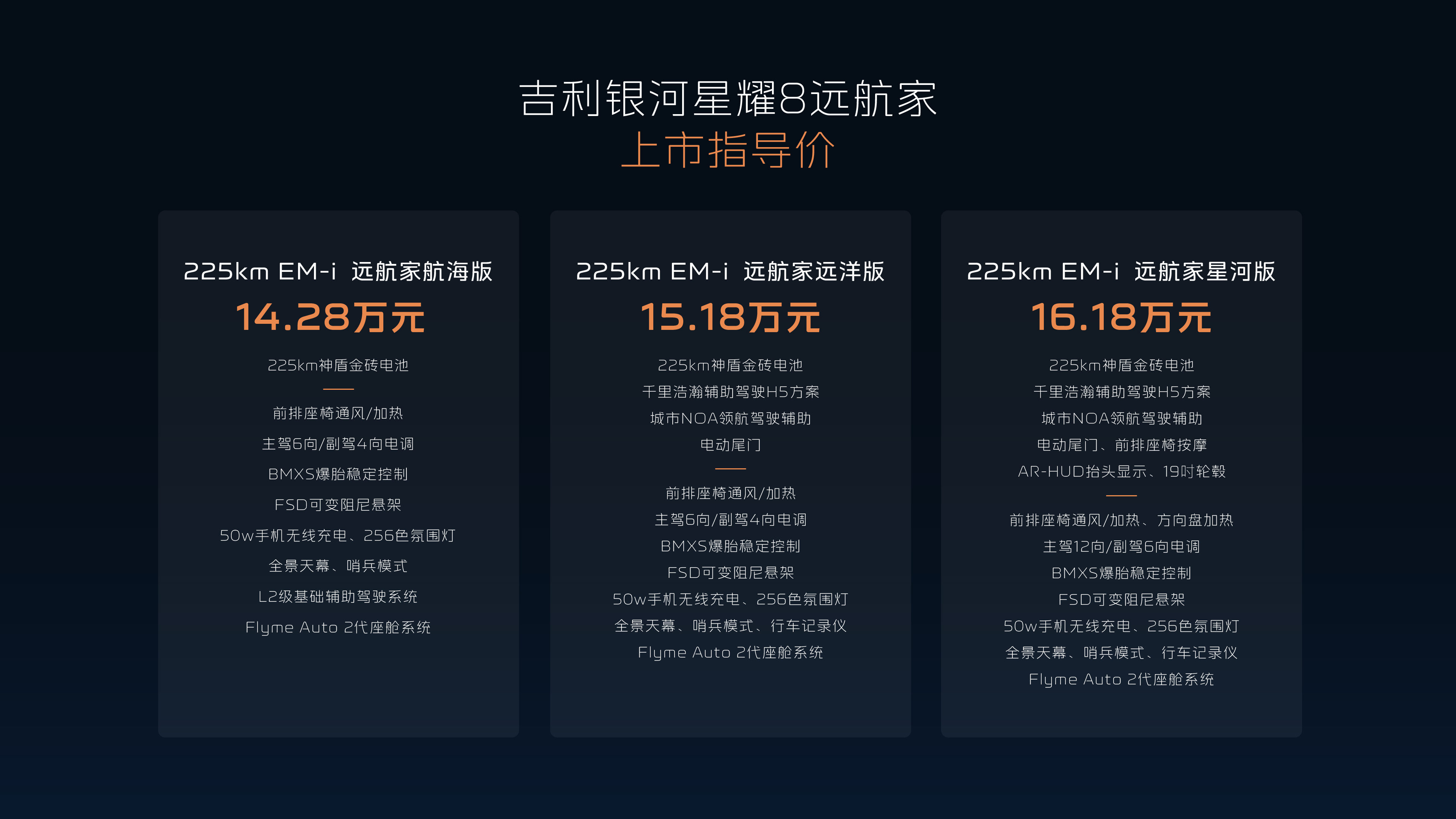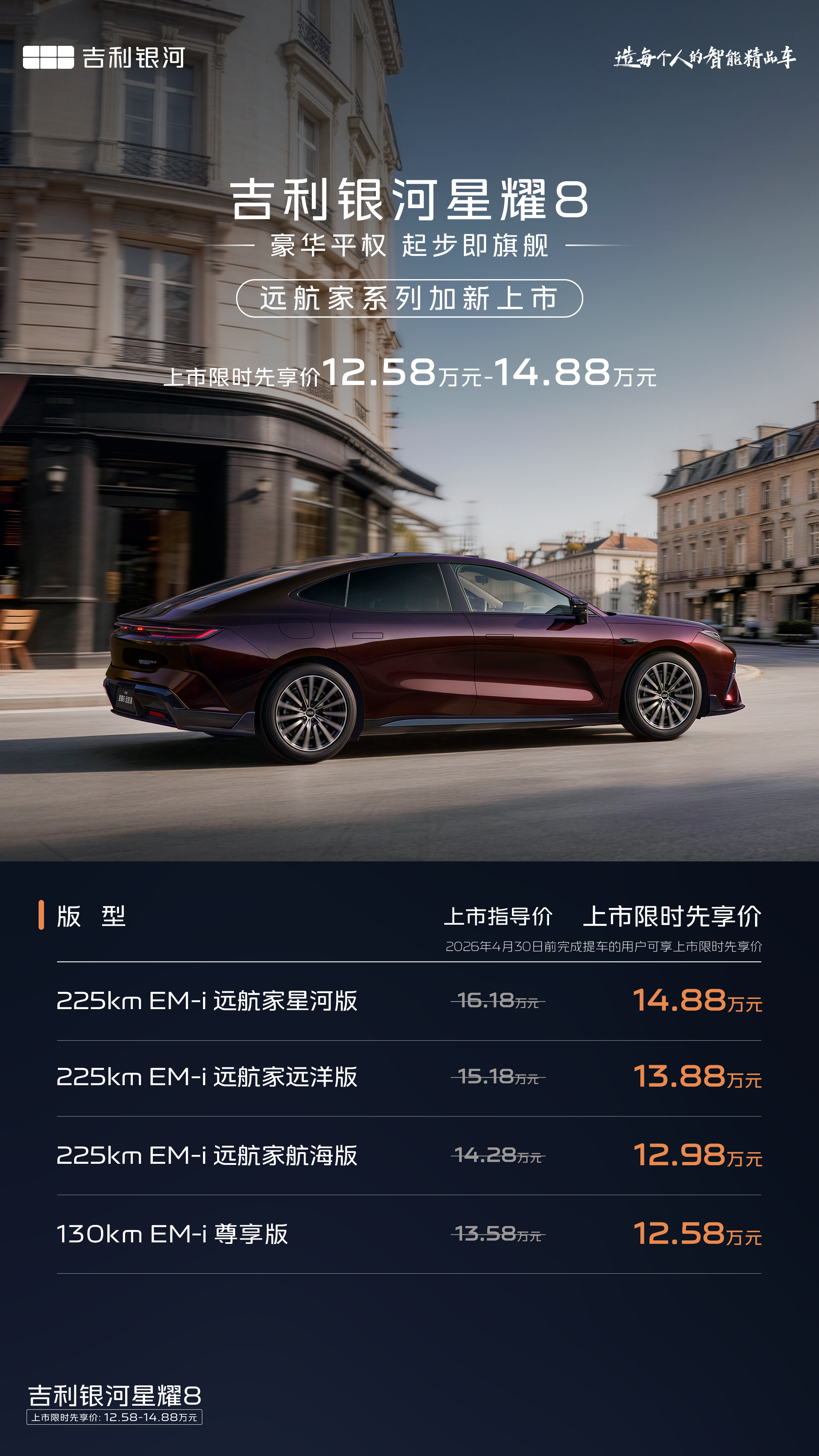 12.58万起满配开抢!吉利银河星耀8远航家加新上市,新增225km纯电续航三款版型,神盾金砖电池+激光雷达高阶智驾直接拉满,雷神EM-i电混系统馈电油耗3.32L、综合续航1700km+,还有23扬声器影音、VIP电动行政座椅等旗舰豪华配置,上市限时9重购车权益加持,20万内插混轿车价值新标杆,闭眼入不亏~吉利银河星耀8