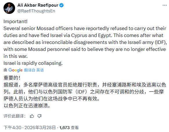 大批摩萨德特工逃离以色列? 近期有消息称,多名摩萨德高级官员已脱离职务,通过塞浦路斯和埃及逃离以色列,而国防军则称“清洗”了部分摩萨德人员。 要说这分歧的根源,其实早有苗头,最近这一个月更是彻底爆发,大家都知道,以色列跟伊朗打了快一个月了,国防军忙着空袭伊朗的核设施、军工企业,3月27号还空袭了伊朗的洪达卜重水反应堆和亚兹德省的铀提炼工厂,30号一天就袭击了170个伊朗目标。 可摩萨德这边呢,想法跟国防军完全不一样,之前摩萨德还跟美国中情局一起,偷偷策划了一个大胆的计划,想联合库尔德武装地面入侵伊朗,推翻伊朗政权,摩萨德负责人还拍着胸脯说这计划万无一失,结果不仅被泄露了消息,还遭到了美国和库尔德人的反对,最后彻底黄了。 这一下就炸锅了,国防军本来就觉得摩萨德净搞些不切实际的花架子,耽误正事,现在计划泡汤,还惹得伊朗处处提防,更是火上浇油。 更可气的是,摩萨德局长还被指责误导美以政府,说他声称能鼓动伊朗国内暴动,结果啥也没办成,这不纯纯打肿脸充胖子吗? 国防军心里憋着一股火,觉得摩萨德办事不力,还拖后腿,于是就有了“清洗”摩萨德人员的说法,至于清洗了多少人,具体是谁,国防军没明说,就含糊其辞地暗示了一下,这种遮遮掩掩的样子,反而更让人多想,说不定内部已经乱成一锅粥了。 而摩萨德的高层,估计也是看透了局势,知道再待下去没好果子吃,要么被国防军“收拾”,要么因为之前的计划失败背黑锅,干脆就选择跑路,毕竟塞浦路斯对以色列人来说,本来就是免签的,走起来也方便,悄无声息就能离开这个是非地。 说起来也挺讽刺的,以色列一直号称自己的情报和国防体系世界顶尖,结果现在倒好,内部先闹起了分裂。 国防军忙着在外面打仗,还要回头“清理门户”,摩萨德则是人心惶惶,高层跑路,底层人员估计也慌得不行,这哪还有心思搞情报、保国家安全。 更有意思的是,以色列国防军总参谋长最近还说,军队兵力吃紧,都快“内部崩溃”了,一边要应对伊朗的反击,一边要在黎巴嫩南部部署部队,还要处理内部和摩萨德的矛盾,简直是腹背受敌,这时候摩萨德高层跑路,无疑是雪上加霜。 其实说白了,这就是以色列内部各部门争权夺利、意见不合的结果,国防军想靠硬实力打服对手,摩萨德想靠情报和阴谋诡计出奇制胜,想法不合也就罢了,还互相拆台、互相“清洗”,到最后受损的还是以色列自己。 现在外界都在看以色列的笑话,毕竟一边对外开战,一边内部内斗,这种操作也是没谁了,摩萨德的特工跑出去之后,会不会泄露以色列的情报,国防军和摩萨德的分歧还会闹到什么地步,这些都还是未知数,但可以肯定的是,以色列接下来的日子,不会太好过。 毕竟连自己内部都团结不起来,还想着在中东横着走,简直是天方夜谭,说句实在的,与其忙着内斗和对外挑衅,不如好好想想怎么平息冲突,不然到最后,可能不仅仅是摩萨德特工跑路,连普通民众都要想办法逃离这个常年战乱的地方了。 大家对此有什么看法呢?欢迎各位在评论区留言!