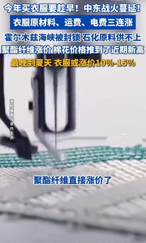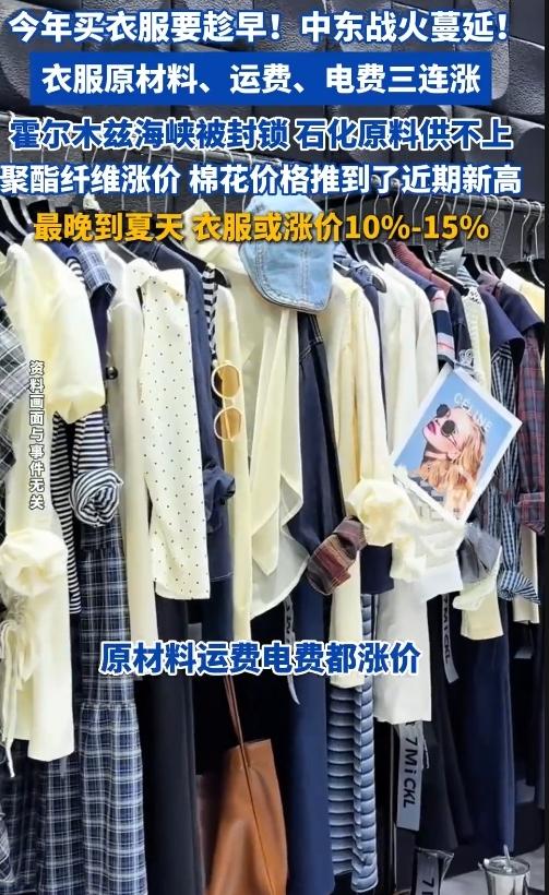 衣服要涨价?这事得趁早打算! 姐妹们注意啦!今年想买春夏新装的,可得抓紧动手了!业内人士都在提醒,晚了可能要多花不少钱,这可不是开玩笑的! 为啥这么说呢?这事儿还得从南亚那边说起。咱们穿的衣服,有近三分之二都用到涤纶、尼龙、腈纶这些合成纤维,而南亚可是全球重要的服装出口地,这块产业价值高达500亿美元。以前,南亚生产这些纤维的原材料,很多都来自海湾地区的石化工厂。 可现在不一样了,中东那边的战事影响太大了。南亚的服装厂想拿到用原油、天然气做的石化原料,变得特别难。原料一紧张,聚酯纤维的价格就涨了,这还不算完,连棉花价格也跟着涨了——毕竟合成材料贵了,厂家就更愿意用相对便宜的棉花,需求一上来,棉花价自然就上去了。 除了原材料,电费和运费也是笔大开销。伊朗那边封锁了霍尔木兹海峡,南亚的服装厂没了稳定的天然气供应,电费蹭蹭往上涨。而且,伊朗对海湾地区机场的无人机和导弹袭击,让快时尚订单的航空货运费涨了足足70%,这条航线都快没法用了。 不过现在大家还好,因为厂家手里有之前按固定价格订的货,暂时自己扛着这些额外成本。但库存总有卖完的那天,到时候衣服价格肯定得涨,业内估计可能要多花10%到15%的钱。 所以啊,要是今年有添置春夏装的计划,真得早做打算,别等涨价了才后悔。你们打算什么时候给衣柜添新衣服?觉得哪些款式值得趁早入手?来评论区聊聊,也别忘了把这消息转发给身边的朋友~ 今年买衣服要趁早 服装价格上涨 春夏穿搭春夏 信息来源:大众新闻.半岛都市报