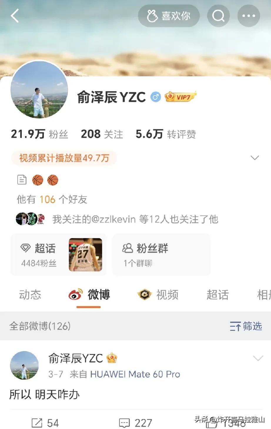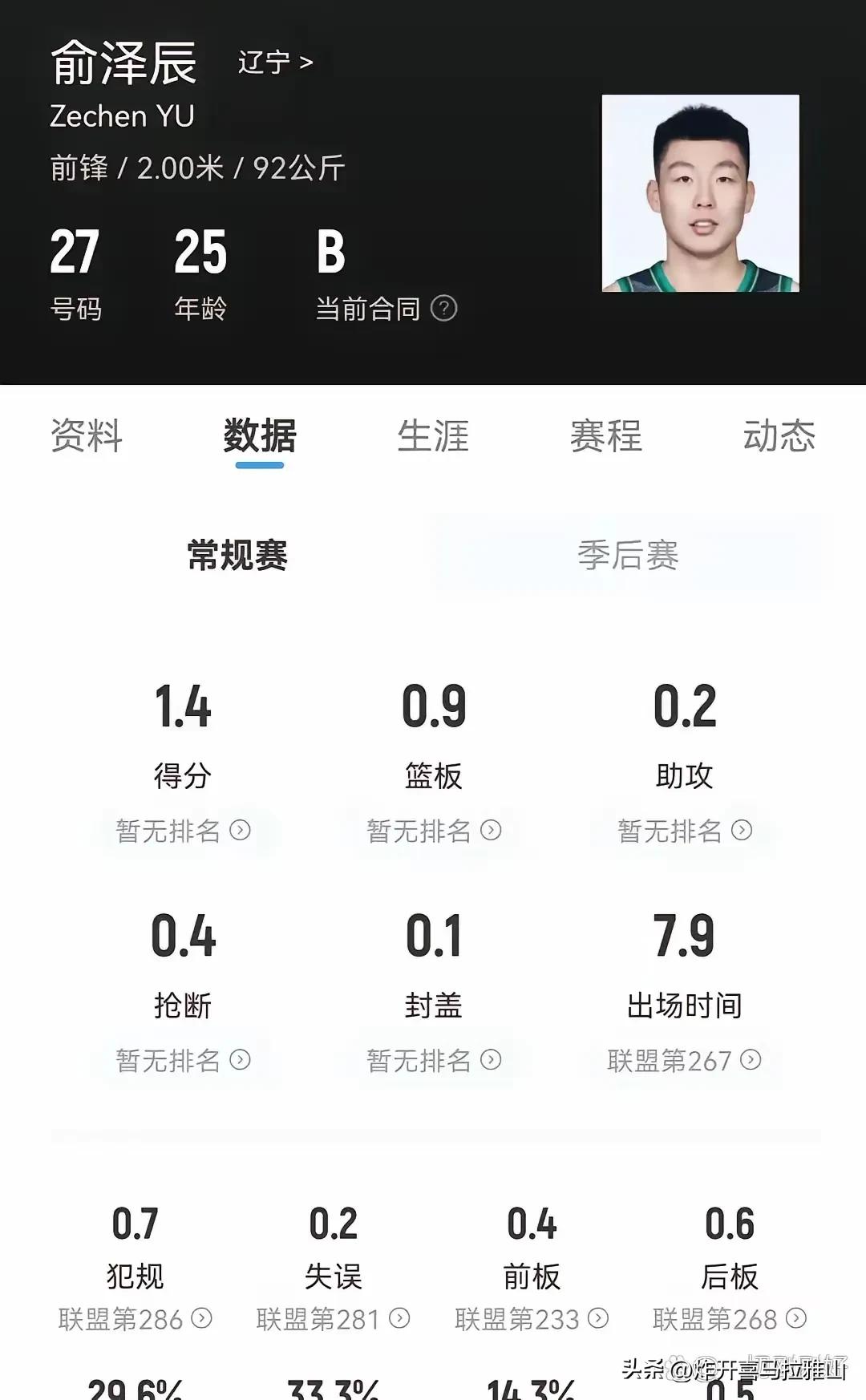 辽宁队的俞泽辰大概率是在窗口期要转会其他球队了,主要有这三个迹象。 1、在乌戈教练上任以后俞泽辰就很难进入大名单了,最多也就打打潜力赛,他在球队中已经没有位置了,姜宇星都打替补捞不到多少上场时间,更别提俞泽辰了。 2、他的微博认证已经没有了辽宁队认证了,这很可能预示着他即将要离开辽宁队,也可能释放一些不满的情绪。 3、俞泽辰已经不年轻了,今年26岁了,现在无球可打,这么浪费大好青春有些不甘。球队确实是没有位置,更准确的说他不适合辽宁队,杨鸣时期给他很多机会,他确实没有抓住,上场后攻防都不能让球队满意,乌戈教练之后他就彻底的被弃用了。这么多年球技进步真的不大,身体素质是真好。 总结,俞泽辰尽快去一个能给上场时间的球队,福建队,宁波队,吉林队或者江苏队,先把数据打出来,打出自己的价值,否则去哪个球队都很难上场。他不会彻底的离开辽宁队,他的类合同在2027年夏天到期,大概率是以租借的形式转会。