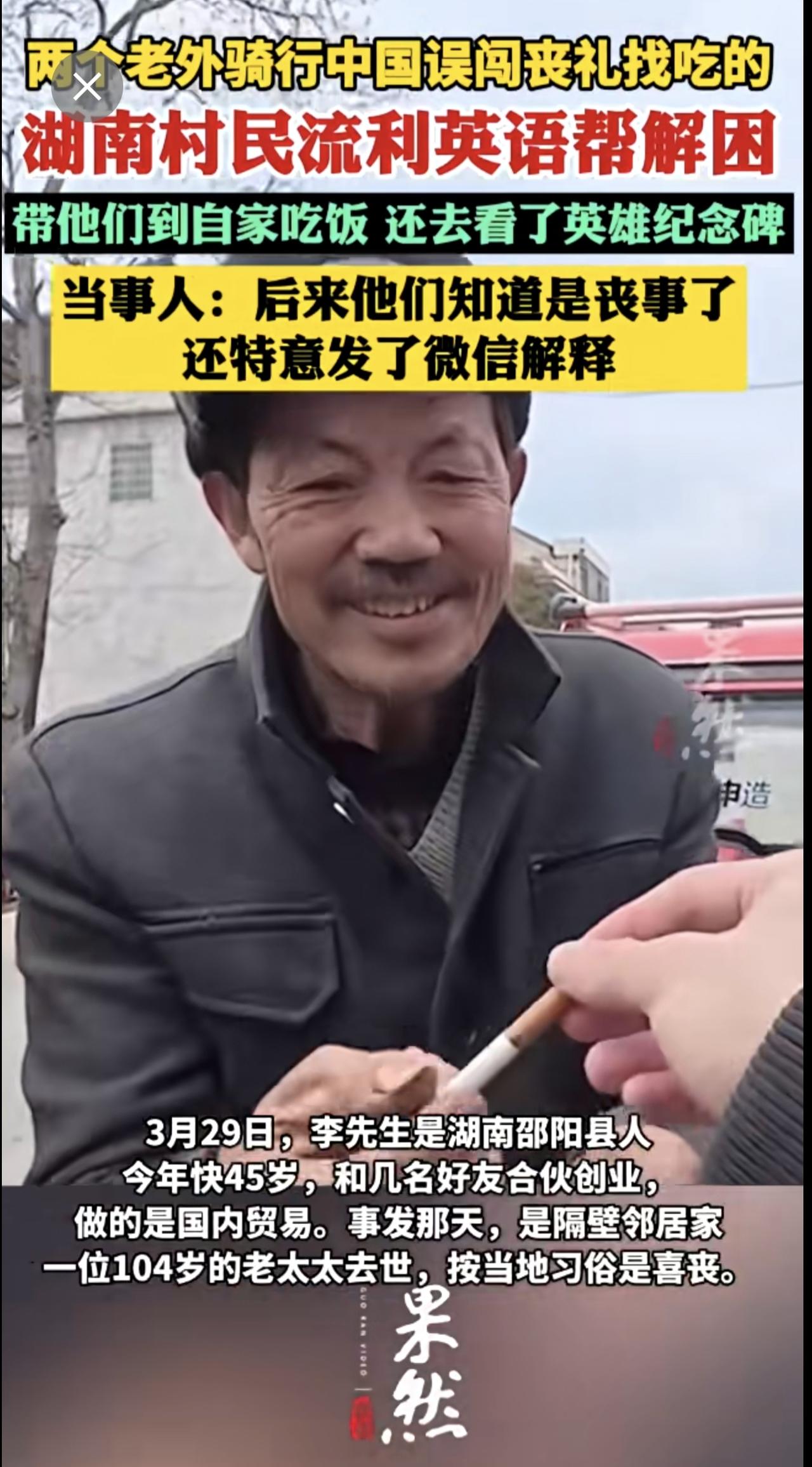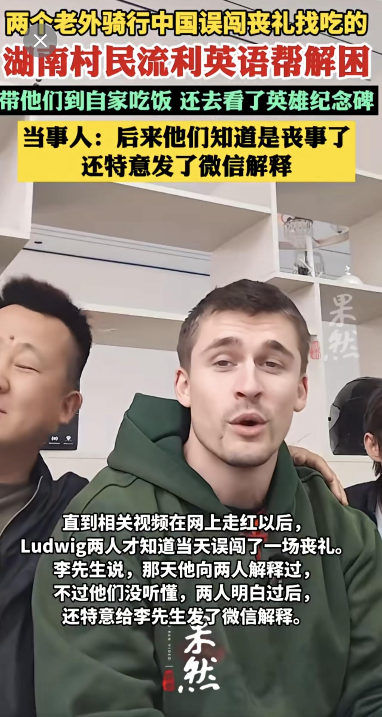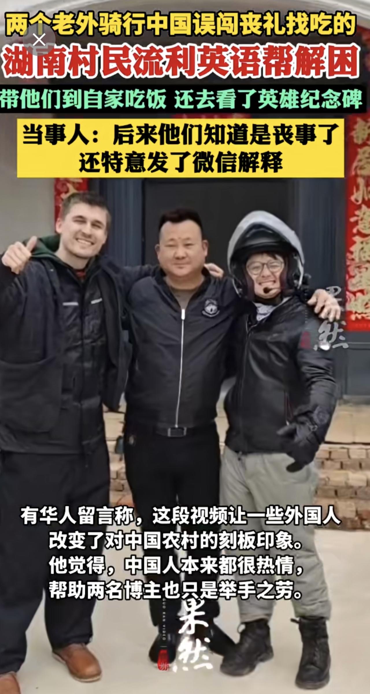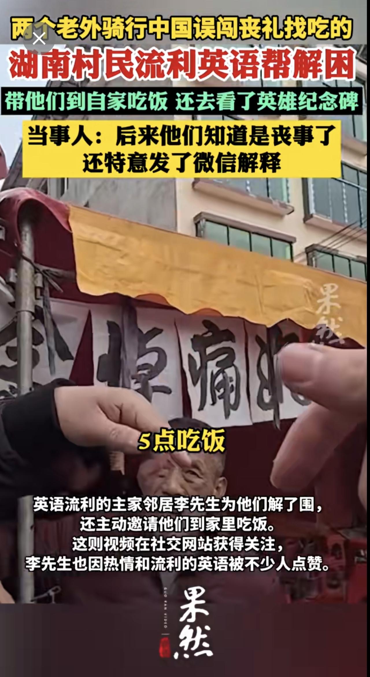 两个老外骑行中国误闯丧礼找吃的,湖南村民流利英语帮解困:带他们到自家吃饭,还去看