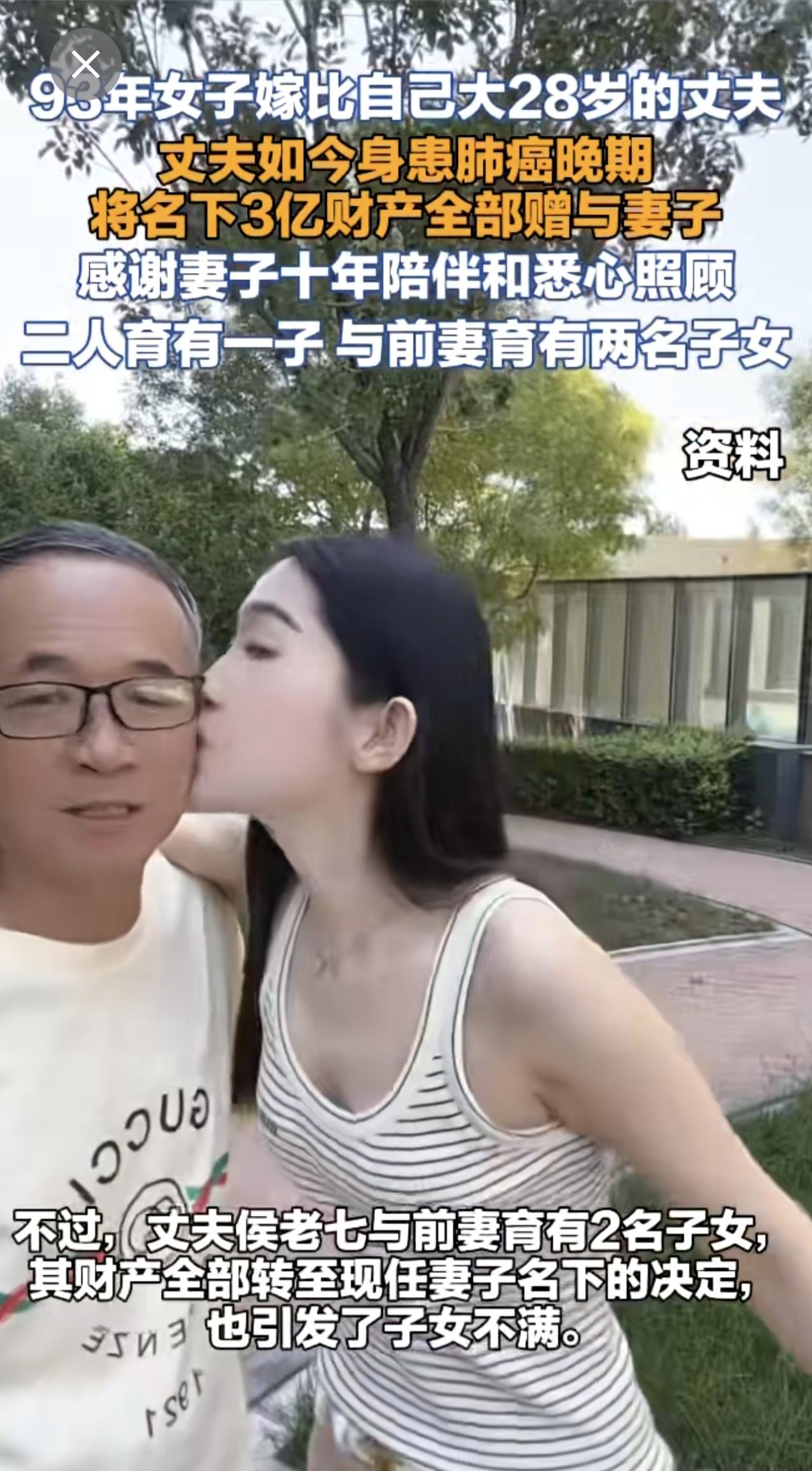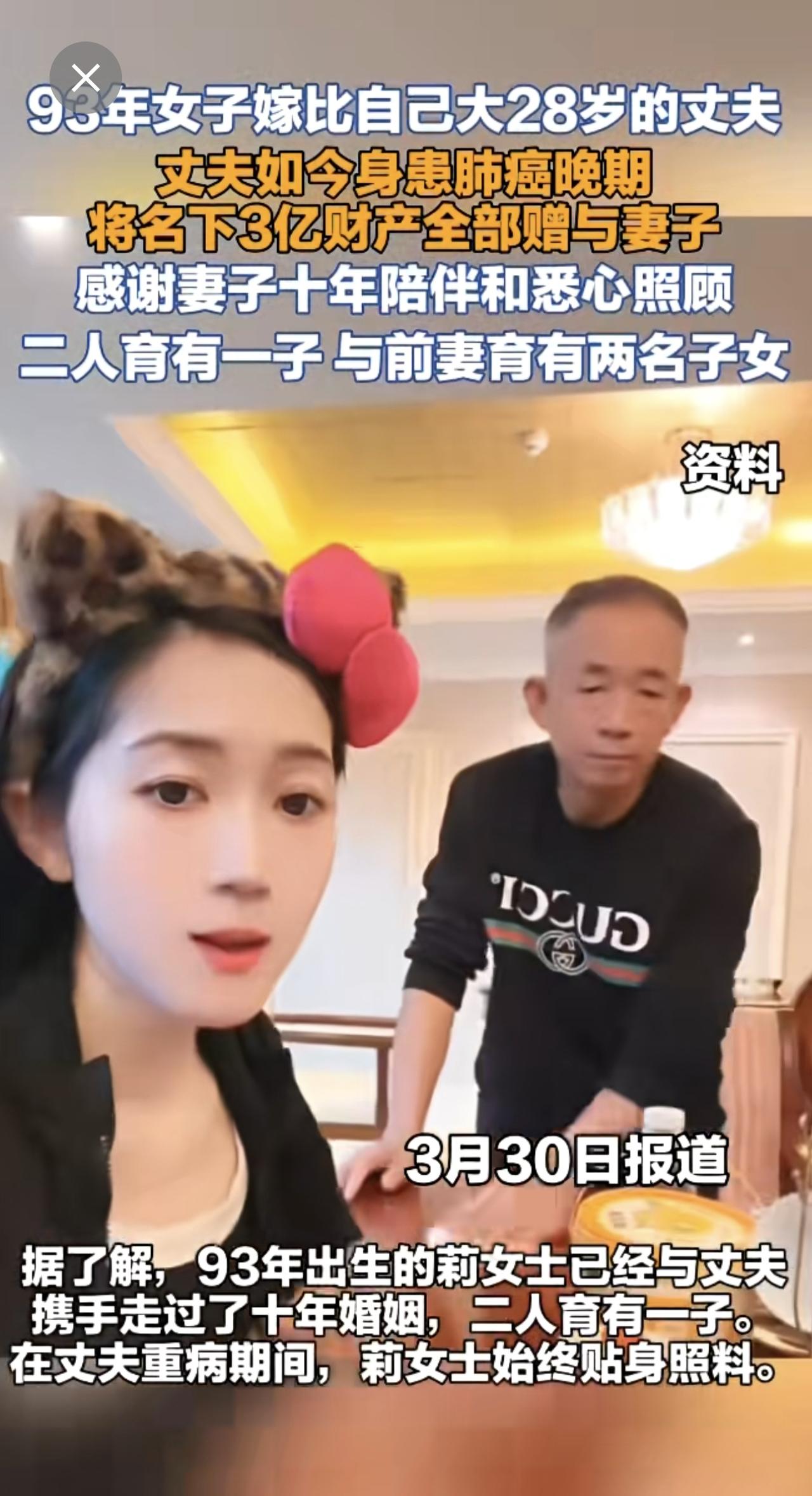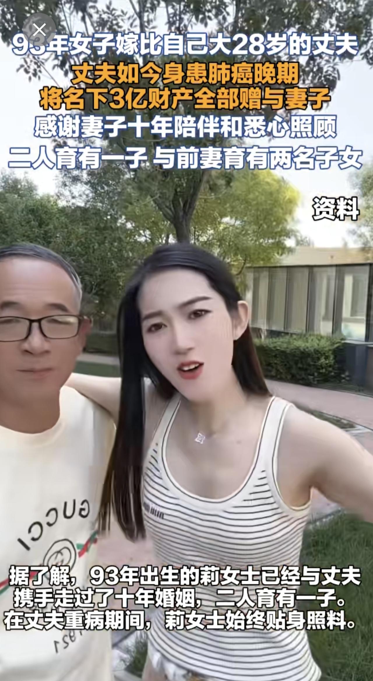 93年女子嫁比自己大28岁的丈夫,丈夫如今身患肺癌晚期,将名下3亿财产全部赠与妻子。
