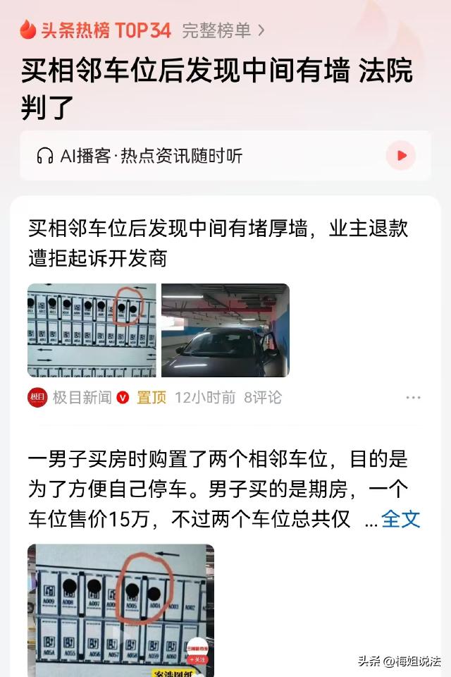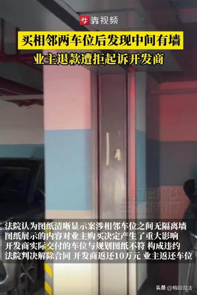 湖南湘潭,王先生花10万元买了两个相邻的车位,交付后发现两个车位中间隔着一堵消防墙,车停进去后门都打不开。王先生找开发商理论,可对方说:车位已经卖完了,不能调换,两个车位交付给你,交易已经达成,不能退钱! 据、三湘都市报等报道,王先生几年前买了一套期房。 王先生家有两辆车,买房的时候他就考虑到了停车问题,直接订了两个车位。当时王先生直接和开发商说,他的两个车位要挨在一起的。 王先生买房的时候,小区刚开盘,针对最先交钱的业主有优惠,一个停车费只需要5万元。 王先生二话不说,直接拿下了两个车位,对方给他看了图纸,确认了车位的位置。 王先生近些年经常看到车位方面的纠纷,所以他留了个心眼,在签合同的时候和对方做了个约定,如果车位及车位的配套设施不能满足日常停车需求,到时候对方要免费给他调换。 但是对方也对王先生做出了限制,表明万一出问题,会按照当初买车位的价格免费进行调换,但是王先生不能根据这个向他们索赔,或者追究其他的法律责任。 付完钱后,王先生开始了漫长的等待。2024年年初,王先生接到通知,称房子及车位已经建设完毕,让他过去收房。 王先生高兴坏了,立马拉着一家老小高高兴兴去看房。 一群人先去看了房子,房子没什么大问题,但是等王先生去看车位的时候,却发现,车位和他当初看到的图纸完全不一样。 王先生当初要的是两个相邻车位,挑选车位的时候,也是看过图纸,精挑细选的。 可是王先生实地查看的时候,发现他的两个车位中间竟然砌了一堵高墙,而且这道墙属于消防墙,不能拆除。 王先生尝试着停了一下车,因为墙体的存在,他的车停进去之后,靠近墙那一边的车门不能完全打开。 如此一来,停车的时候就要多加小心,车停下来之后下车非常不方便,而且稍不注意就会蹭到车门。 王先生不能接受,当初看图纸的时候,图纸上面根本没有这堵墙的存在,现在两个车位之间莫名其妙砌了堵墙,他认为这是开发商履行合同义务不符合规定。 于是王先生找到对方,要求按照当初约定的给他重新换两个车位。 可让王先生没想到的是,现在大家生活条件普遍好了,都提前想到了停车问题,地下室的停车位已经快卖完了,根本找不到符合王先生要求的车位。 王先生没办法,又要求对方退钱。 可对方却说,车位之间虽然加了堵墙,但是车位的长宽是符合规定的,并不影响使用,并以此拒绝退钱。 多次协商无果,王先生一怒之下起诉开发商,以合同目的无法实现为由要求退钱。 那么,从法律角度来说,王先生是否可以要求退钱? 王先生与开发商签订合同时约定,如果车位及配套设施不能满足日常停车需求,对方应当免费调换。 收房后,王先生发现车位中间出现了一堵消防墙,导致车停进去车门无法完全打开,严重影响日常停车,此时,对方已经违反上述约定。 虽然对方在合同里限制了王先生不能索赔或追究其他法律责任,但并没有限制王先生调换或退款的权利。 根据《民法典》第五百六十三条规定,当事人一方迟延履行债务或者有其他违约行为致使不能实现合同目的,当事人可以解除合同。 王先生买两个相邻车位的目的,是方便自家两辆车停放,两个车位中间出现消防墙,严重影响了王先生的使用体验,使得双方的合同目的无法实现。 并且,当初开发商向王先生展示的图纸中没有消防墙,实际交付的车位却存在消防墙,属于履行合同义务不符合约定。 这种行为构成违约,王先生有权要求对方承担违约责任,在不能按照约定调换车位的情况下,王先生要求退钱是合理合法的。 最终一审认为,两个相邻车位之间是否有隔离墙,对业主来说,使用体验是完全不一样的。 当初王先生买房的时候,对方出示的图纸和宣传资料中并没有隔断墙的存在,图纸和资料的展示,会对王先生的购买决定产生重大作用。 因此一审认为,车位交付后出现的隔断墙与规划图纸不相符,开发商构成违约,应返还王先生10万元车位购置费,王先生也应返还两个车位。