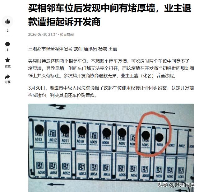 湖南湘潭,业主王鑫买房时,为停车方便特意花10万买了俩相邻车位,本以为能享受便利停车体验,结果收房时傻眼了!两个车位中间竟冒出一堵厚墙,还是不能拆的消防墙,靠墙一侧车门都打不开,上下车困难。更气人的是,开发商给的规划图纸上根本没标注这堵墙。王鑫多次找开发商协商退款,都被无情拒绝,无奈之下只能将开发商告上法庭。 (来源:极目新闻、) 王鑫这人,很实在,当初买房时想着家里两辆车,买俩相邻车位停车方便,以后不用到处找车位,也不用担心被别的车堵住。 他多花了10万把这俩车位拿下了,交钱的时候,销售还拍着胸脯保证,车位绝对没问题,规划图纸上清清楚楚,两个车位中间啥都没有。 王鑫满心欢喜地等着收房,想象着以后停车轻松的场景,可到了收房那天,他到车位一看,整个人都懵了。 俩车位中间,不知道啥时候冒出来一堵厚墙,这墙还是消防墙,开发商说绝对不能拆。 王鑫试着把车停进去,发现靠墙一侧的车门根本打不开,人要下车得从另一边挤出去,特别费劲。 王鑫越想越气,他赶紧找出当初开发商给的规划图纸,仔细一看,图纸上根本就没这堵墙,他觉得开发商这就是在坑人,明明图纸上没有,实际却多了一堵墙,这不是欺骗消费者吗? 他马上去找开发商理论,要求退款。 开发商那边一开始还敷衍,说这墙是消防要求,没办法解决。 王鑫说那你们图纸上也没标,这不是误导我吗? 开发商却耍赖,说图纸只是参考,实际交付以现场为准。 王鑫气得不行,他觉得开发商这就是不讲道理,自己花了这么多钱买的车位,结果根本没法用,这钱不能白花。 从法律角度来看,开发商的行为明显有问题。 根据民法典相关规定,当事人一方不履行合同义务或者履行合同义务不符合约定的,应当承担继续履行、采取补救措施或者赔偿损失等违约责任。 开发商给王鑫的规划图纸,对王鑫购买车位的决定影响很大,应该算作合同的一部分,现在实际交付的车位和图纸不符,开发商就构成了违约。 王鑫多次找开发商协商退款,可开发商就是不同意,王鑫没办法,只能一纸诉状把开发商告上了法庭。 王鑫把规划图纸、付款凭证等证据都拿了出来,证明开发商存在违约行为。 开发商那边还是坚持说图纸只是参考,实际交付以现场为准。 法官仔细审理了案件,认为规划图纸对王鑫购买车位起到了关键作用,应该视为合同的一部分。 开发商实际交付的车位和图纸不符,确实构成了违约。 最后,法院判决解除合同,开发商退还王鑫10万车位款,王鑫返还车位。 经此一事后,很多业主都担心自己会不会也遇到类似的问题,大家都在议论,以后买房买车位,一定要多注意和了解,不能光听开发商的一面之词。 对于开发商来说,这也是一个教训,做生意要讲诚信,不能为了赚钱就欺骗消费者。 如果总是这样,以后谁还敢买他们的房子和车位呢? 在买房产或者车位时,一定要仔细查看合同和规划图纸,把每一个细节都弄清楚。 如果发现问题,要及时和开发商沟通解决,不要等到收房了才发现问题,那时候可能就晚了。 对于普通消费者来说,在买房买车位等大额消费时,到底该如何更好地保障自身权益,避免陷入类似纠纷呢? 买相邻车位后发现中间有墙 法院判了