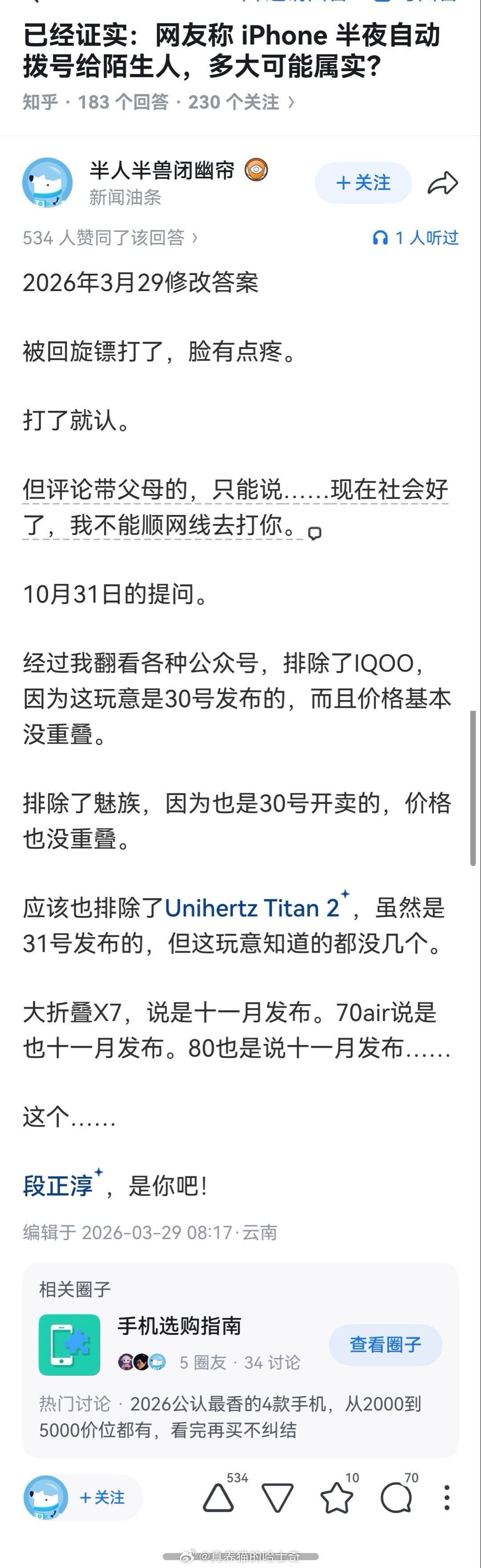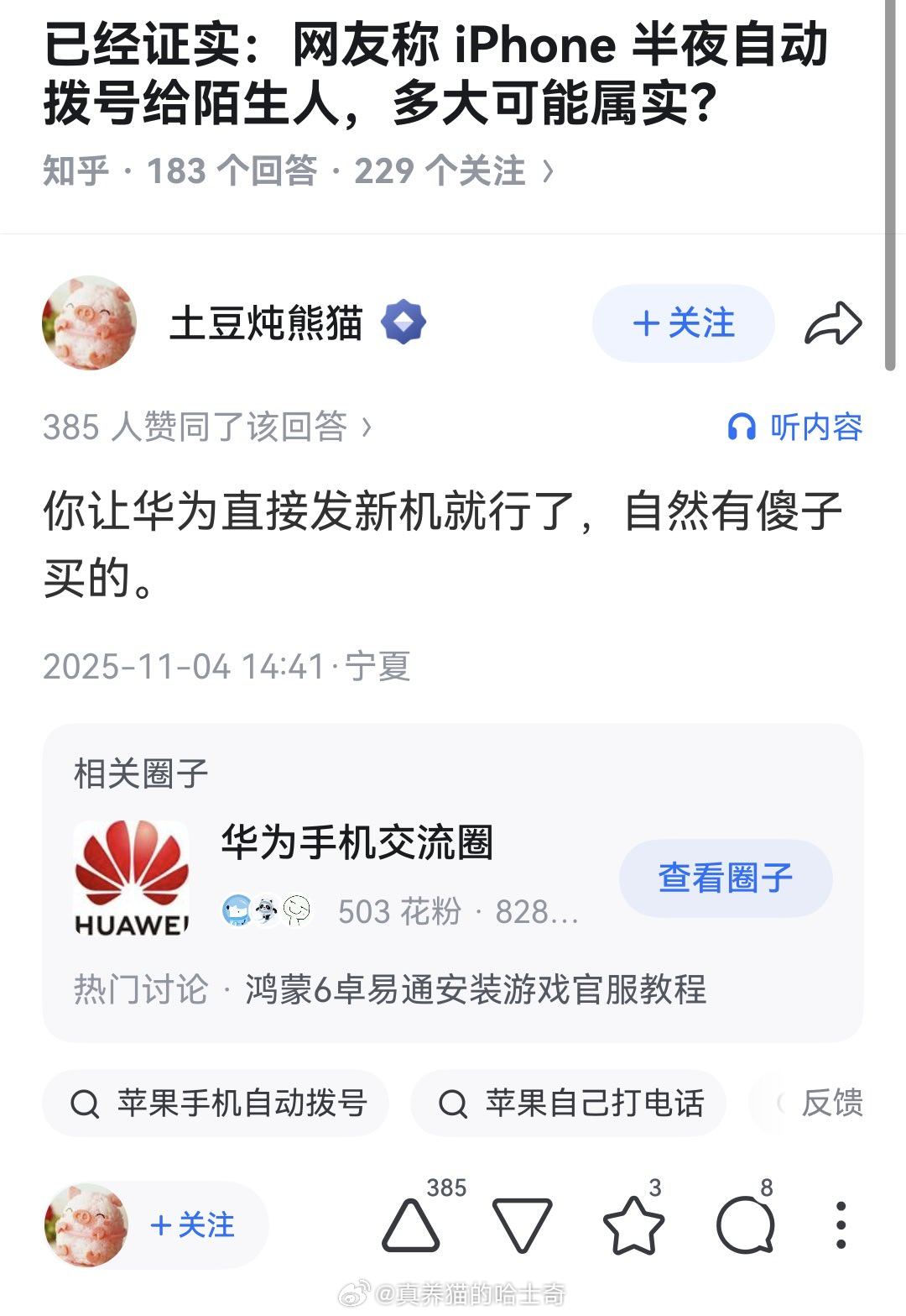 iPhone 半夜自动拨打电话,这是苹果自己都承认的问题(图一),知乎一众高赞一致认为是因为华为要发新机了才有的负面