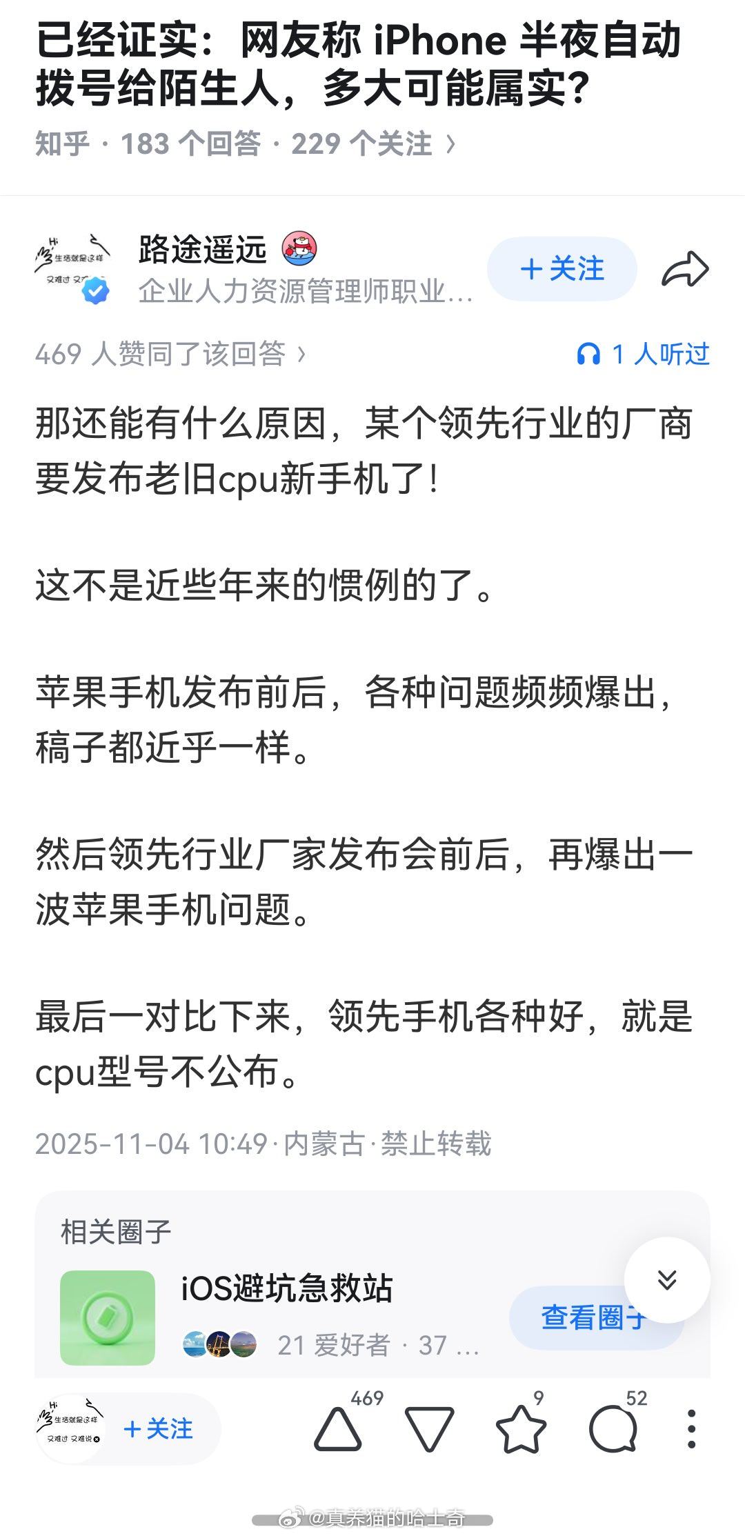 iPhone 半夜自动拨打电话,这是苹果自己都承认的问题(图一),知乎一众高赞一