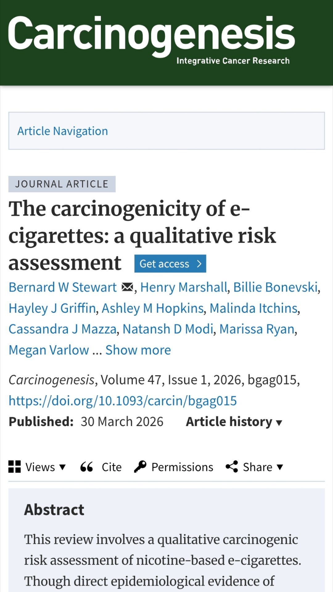 电子烟致癌的新研究!¹ 过去比较多的研究发现电子烟与癌症风险上升显著相关。尤其是肺癌、膀胱癌。新研究发现还有口腔癌。² 划重点:电子烟致癌机制不完全等同于传统烟草,暂时还没有比较两者长期致癌风险大小的高质量研究。但确定的是都致癌。⚠️