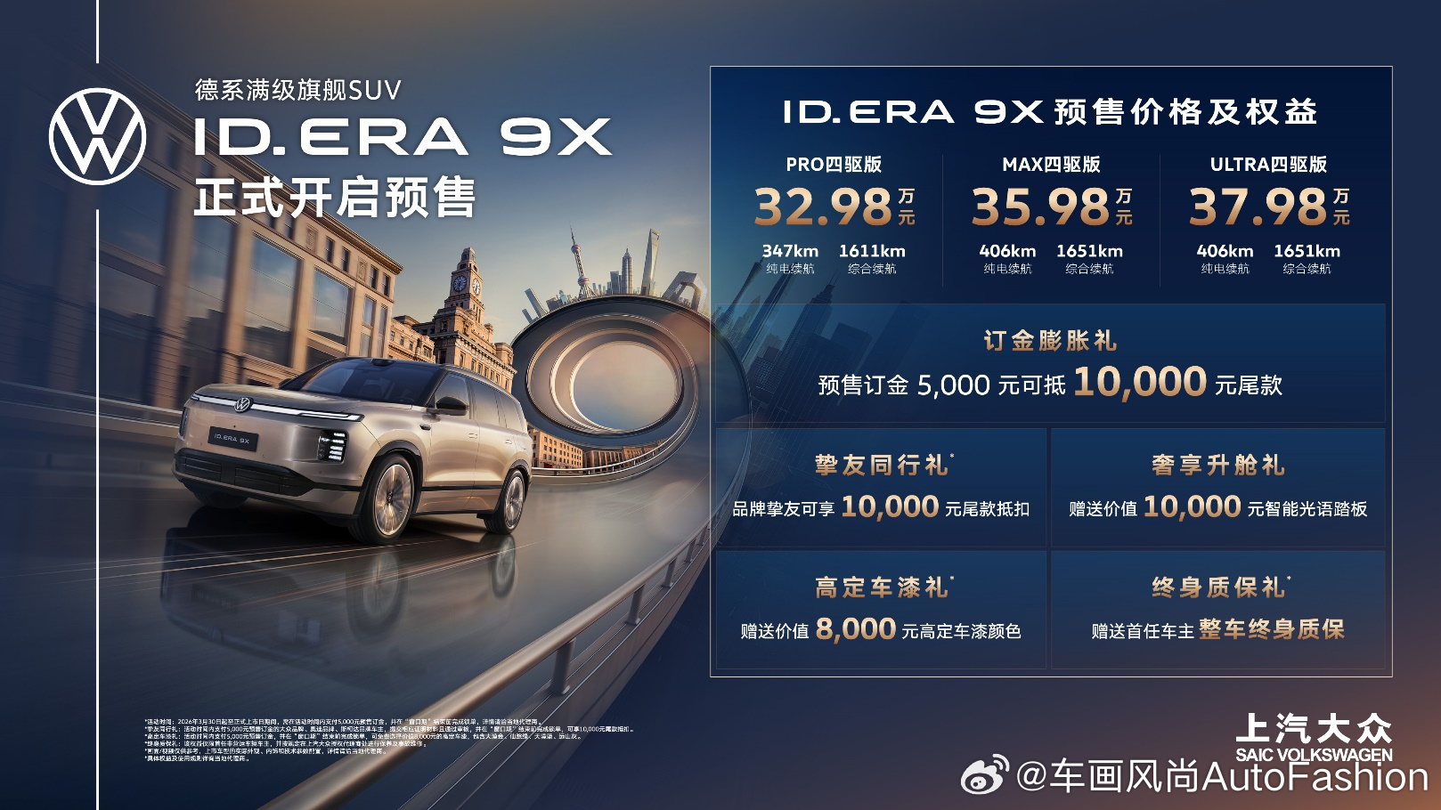 【32.98万起预售!ID. ERA 9X满级登场 星战IP加持打造“超级大众”】3月30日,上汽大众在深圳正式公布旗下“德系满级旗舰SUV”——ID. ERA 9X的预售价格,同时宣布与迪士尼《星球大战》展开IP跨界合作。作为“合资2.0”战略下的重磅力作,ID. ERA 9X深度融合德国百年造车底蕴与中国本土前沿智能科技,本次共推出Pro、Max、Ultra三款四驱版车型,预售价分别为32.98万元、35.98万元和37.98万元。