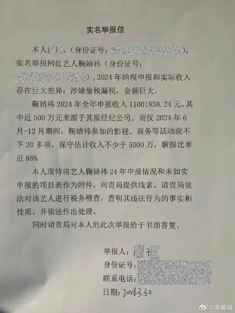 艺人鞠婧祎被实名举报涉嫌偷税漏税,称其瞒报收入比例高达88%,上海市税务局稽查局,已接收举报并启动核查程序