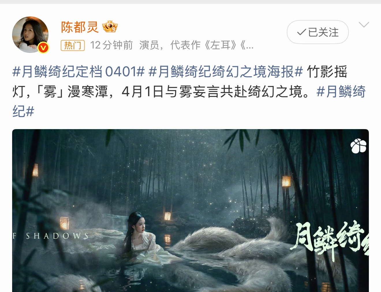 月鳞绮纪定档了,明天开播,雾妄言真的来了,期待陈都灵的表演月鳞绮纪定档